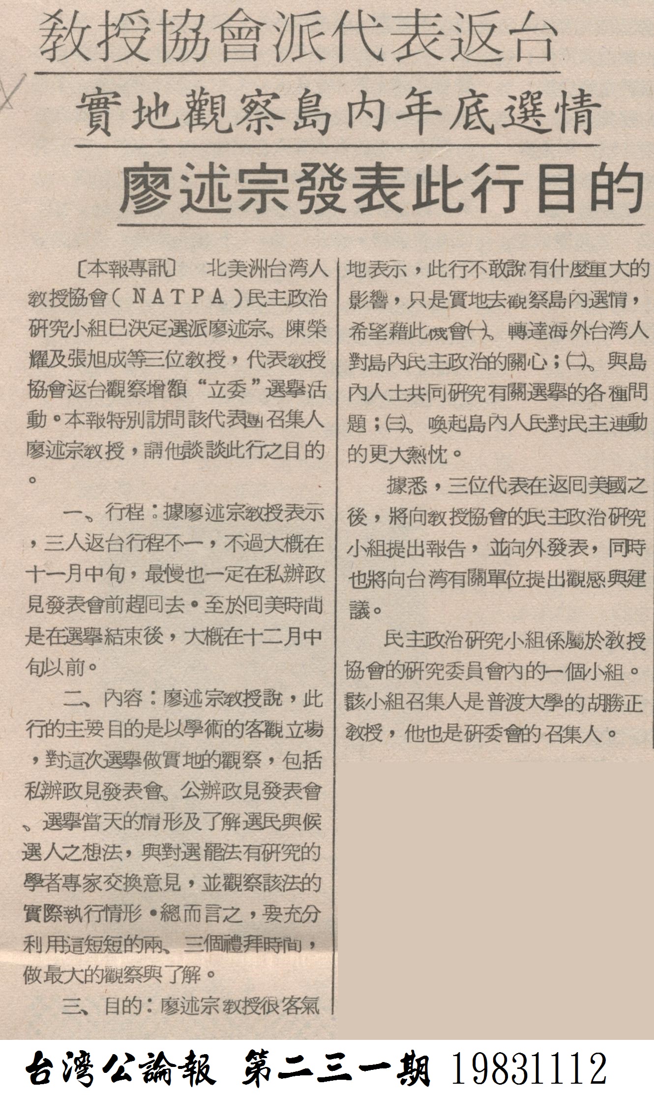 21. 教授協會派代表返台實地觀察島內選情 September 23, 2015 Admin1 12. Political and Social Activities Related with Taiwan