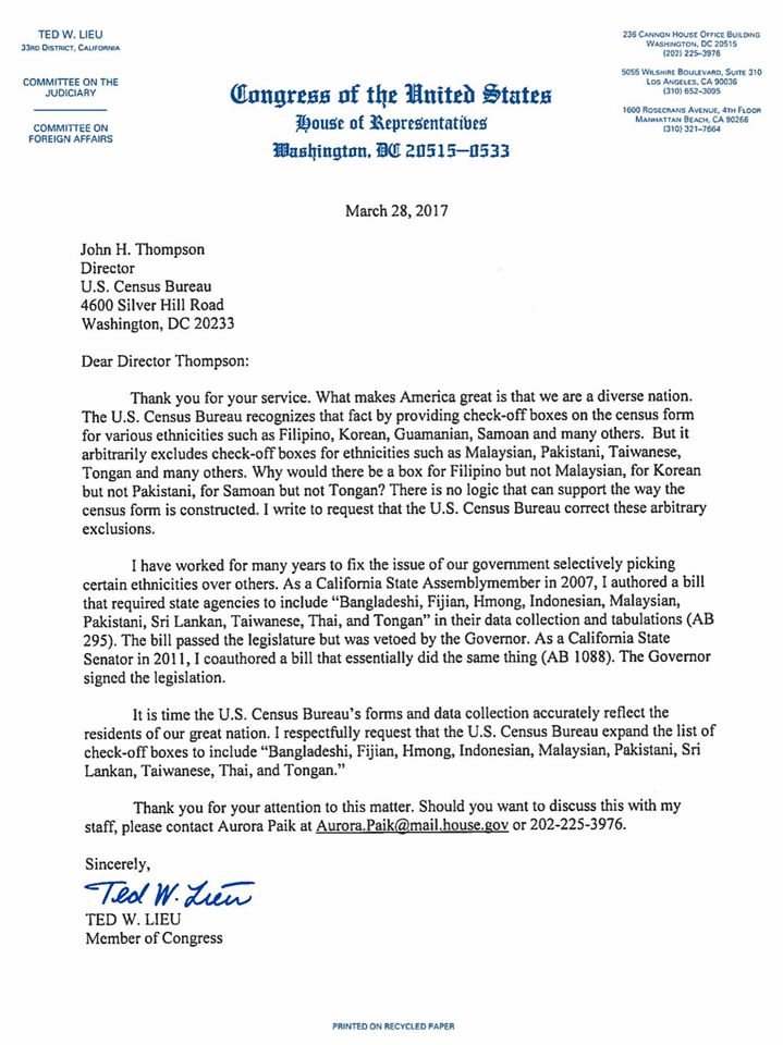 It is time the U.S. Census Bureau’s forms and data collection accurately reflect the residents of our great nation. I respectfully request that the U.S. Census Bureau expand the list of check-off boxes to include “Bangladeshi, Fijian, Hmong, Indonesian, Malaysian, Pakistani, Sri Lankan, Taiwanese, Thai, and Tongan.”