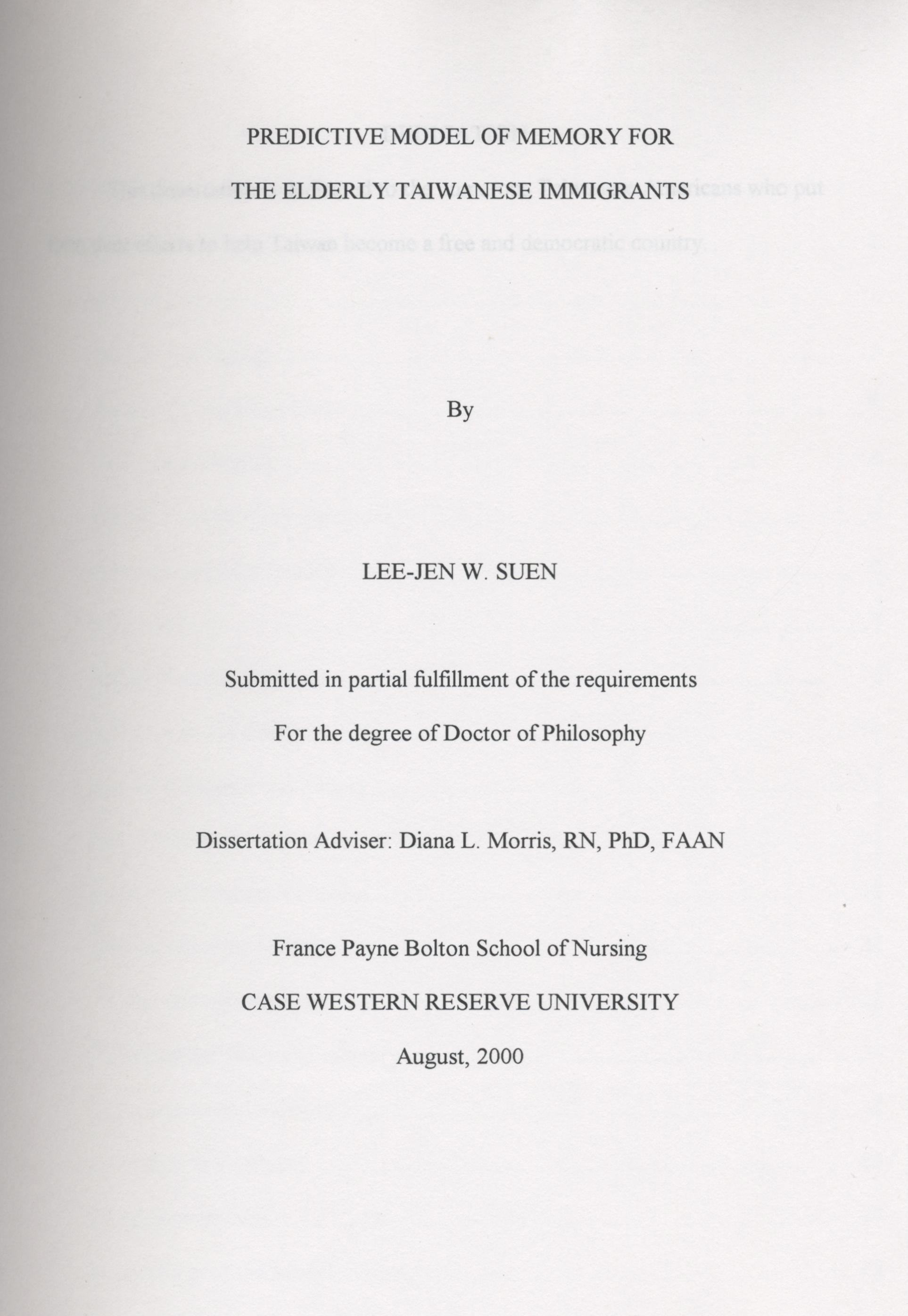 202.Predictive model of memory for the elderly Taiwanese Immigrants/Lee-Jen W Suen/2000/08/Life/生活