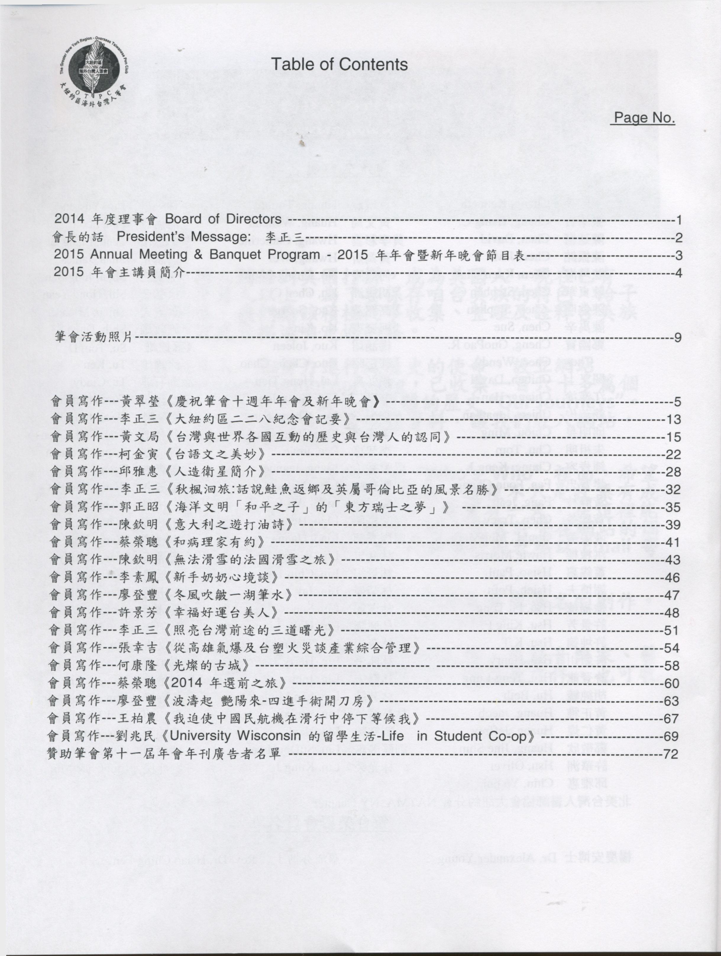 除了報到及註冊,大會節目從下午兩點開始直到晚上十點結束,其中有五節,五小時演講,第一位主講人,是我們的創會會長蔡榮聰醫師,他的講題是”Critical thinking and decision making—How to make a good choice?”第二位是多才多藝的陳廷楷教授,他的講題是莎士比亞戲劇中的一部”Measure for Measure”;第三位是 Ed Lin, he is our second generation. He already published 5 books in English, all about Taiwan. His topic is “Telling the Story of Taiwan.” His website is edlinforpresident, so you know what he intends to be ;第四位是我們都十分熟悉的黃正雅醫師。由他主持「重回執政及轉型正義」的論壇,還有蔡明峰先生及黃再添先生參加,做為Panelist,歡迎大家熱烈參與討論;晚宴後有Keynote Speaker周鉅原教授主講「超越黨閥政治的失落,深化台灣民主的民主」。大會的MC是李惠仁醫師,有他在我完全放心,我們絶無冷場。還有,今天節目很多,時間也很長,但節目都很精彩,尤其最後的遊 興節目,希望大家有始有終堅持到最後。敬祝愉快,望您滿載而歸。(12/15/14)