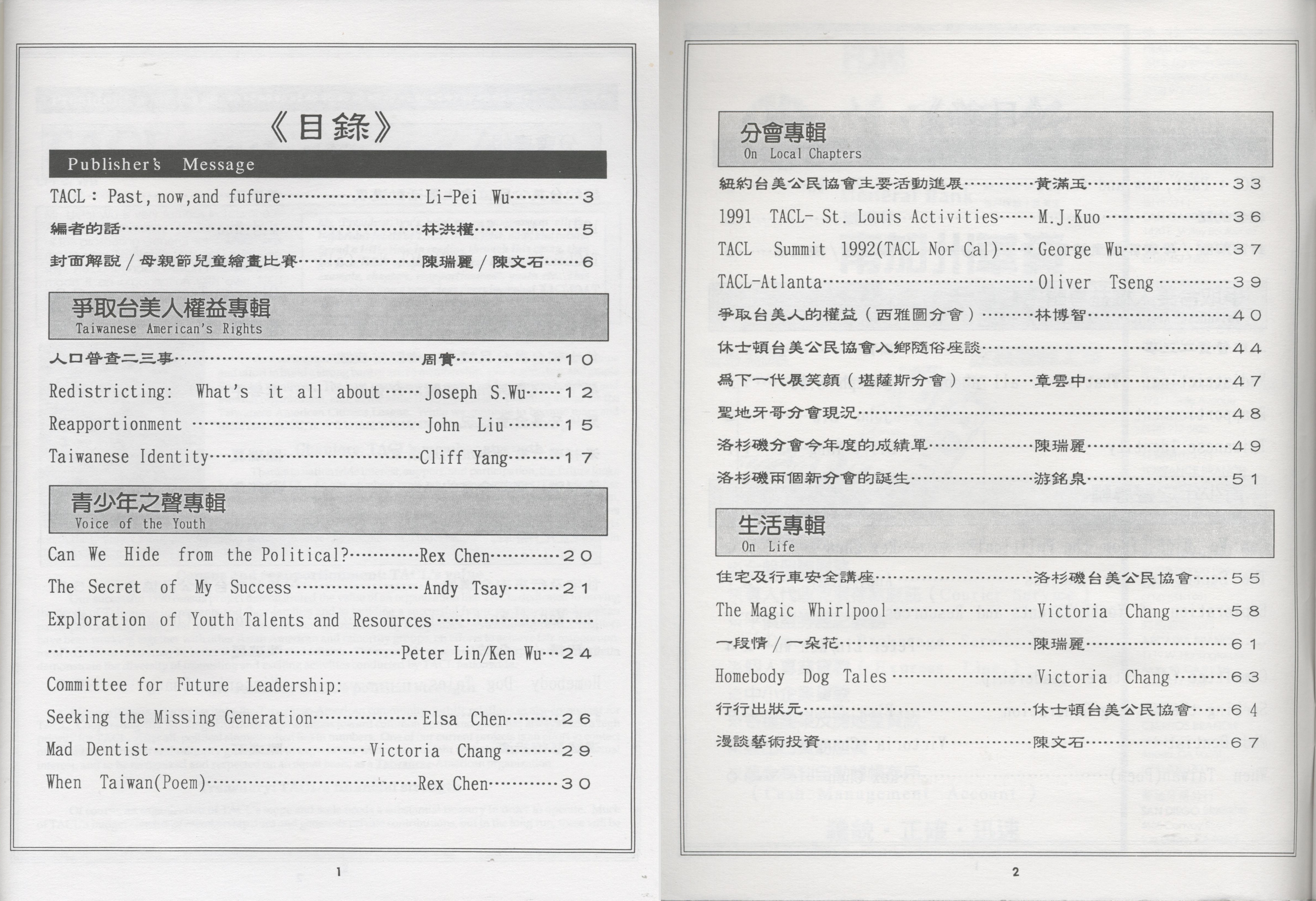 Our successful 1990 census project demonstrated the value of an organization like TACL, dedicated to serving the needs of Taiwanese immigrants and their families and to building a successful future for Taiwanese-American participation, recognition, and influence in mainstream American society and politics. As a follow-up, TACL chapters have been working together with other Asian American and minority groups, on efforts to achieve fair reapportionment so that our needs may be better served by elected officials. The reports from several local chapters in this Bulletin demonstrate the diversity of interesting and exciting activities conducted by TACL nationwide.
