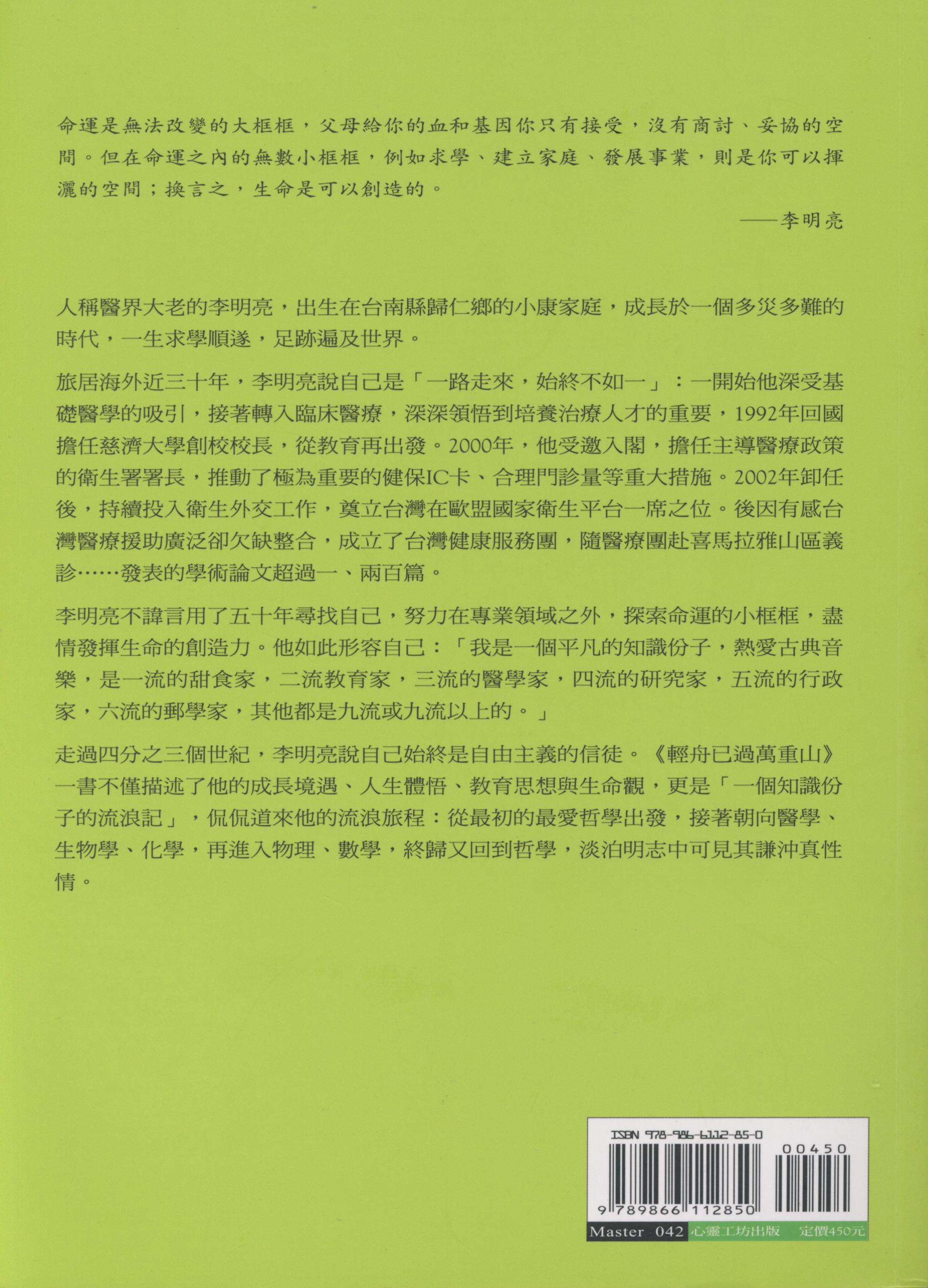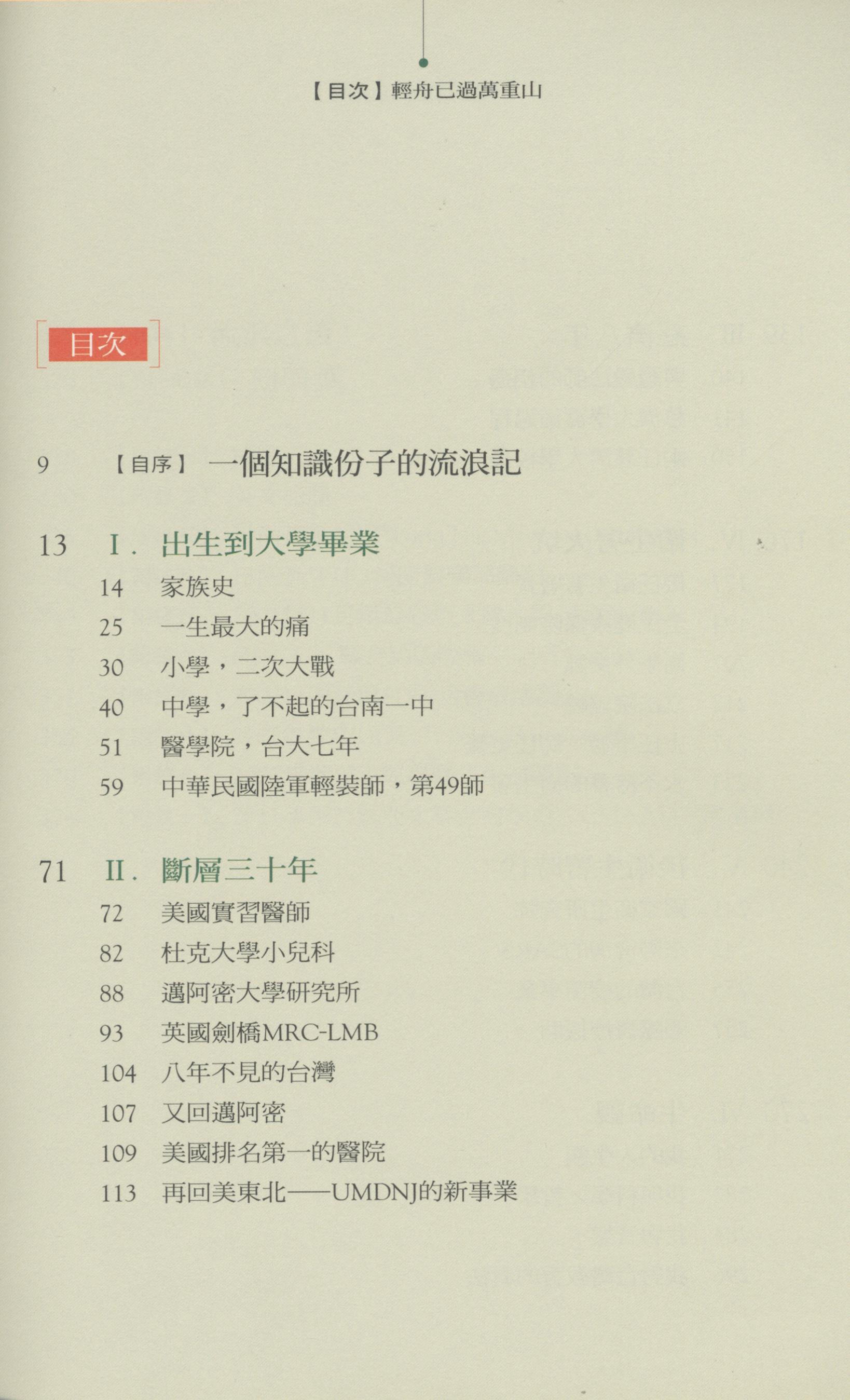 本書嚴格說起來不是傳記,因為它並非完全按年照月記下來的實錄,而是有我平生觀念的陳述及各種紀錄,有散文之形、論述之實。此外,我只是一個平凡的知識份子,我不敢用X X X傳記,僅是個人零零碎碎拾遺之記而已,因此書名令我困擾多時。好友李淑娟小姐知道後:「既然你那麼偏愛舟,何不用李白『早發白帝城』的最後一句『輕舟已過萬重山』?」真是神來一句,也幫我渡過七十五歲這一座重山。台大內科楊偉勛教授看了我的初稿,也說既然我已走過四分之三世紀的醫學人生,何不把「走過四分之三世紀」當成次標題上去,我也很贊成。之後我讀了物理學家Erwin SchrGdinger(1887〜1961)的傳記,其次標是 「生命與思想」(life and thought)。我深覺本書除了記載我四分之三世紀之生命之外,也有不少我的思想,於是我決定加上次標題:四分之三世紀的生命與思想。