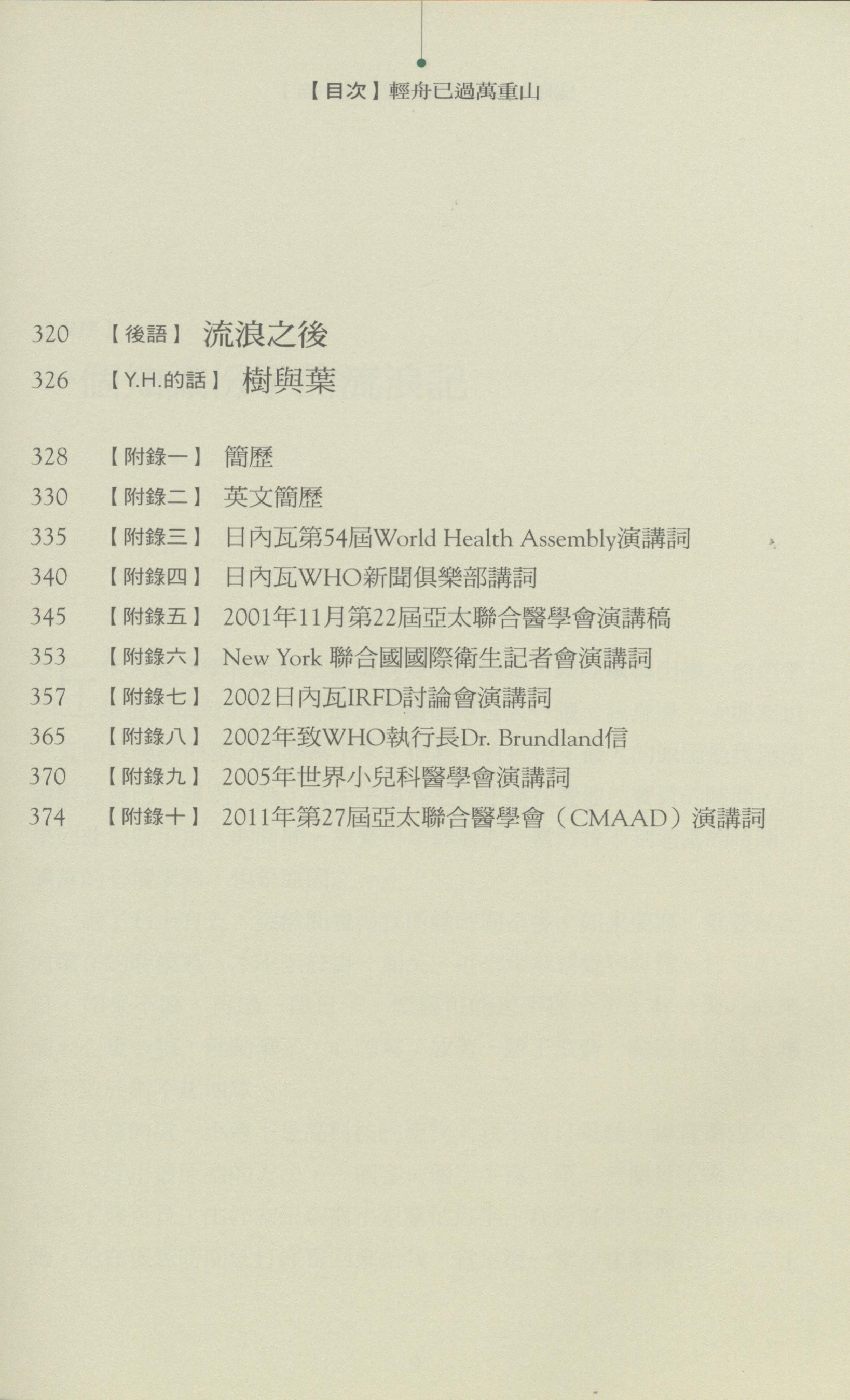 我一生可以說極其平凡,值得留下來者無幾。像這種人可以說比比皆是,但像我這樣運氣好的人就少了。我一生最值得驕傲的是我的好朋友很多,給我的不啻千財萬貫。可惜我的文筆很差,無法形之於文。我一生比較值得留下的書有兩本:一本是得過國內外不少獎項的《台灣民主國——郵史及郵票》,另外一本是《走過SARS》。前者是我用三十年業餘時間所寫下的東西;後者是我冒著生命危險渡過猛爆式生活的記實。二書內涵都不在此重複。除此之外,本書附錄尚有我在國際重要場合的演講稿。值得一提的是這英文翻譯都是出自內人Y.H.手筆。她英國文學出身,用字精準簡潔,使文章生色不少,在國際上得到不少正面迴響,很多人皆說我英文不錯,其實皆出於Y.H.之手。