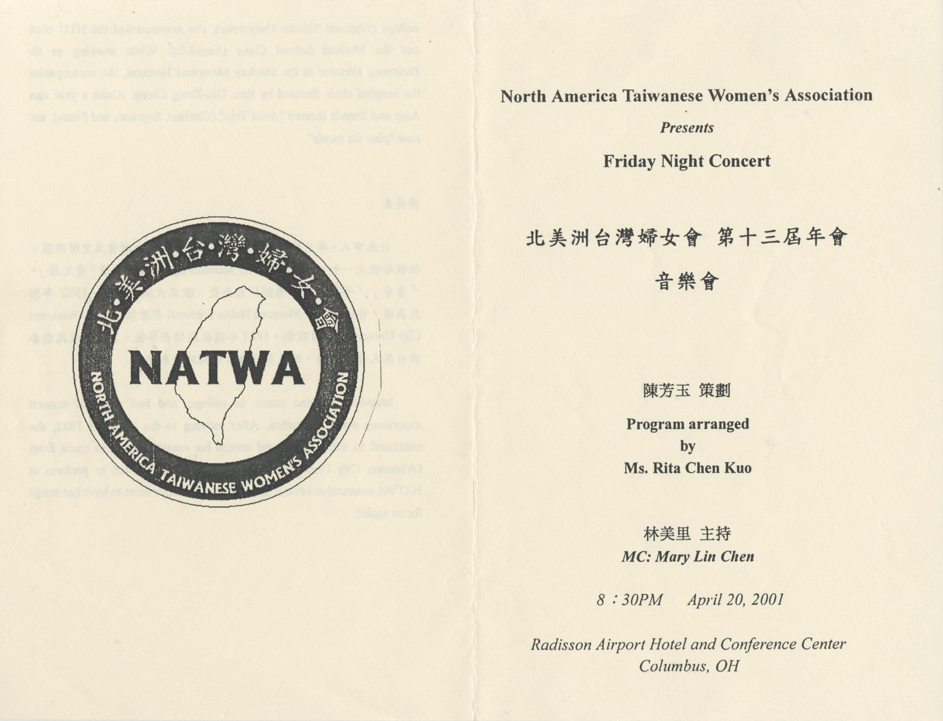 37. NATWA Friday Night Concert 北美洲台灣婦女會 第十三屆年會 音樂會 by NATWA (北美洲台灣婦女會), Columbus, OH on 04/20/2001 August 6, 2015 Admin1 Musical Concerts 北美洲台灣婦女會 第十三屆年會 音樂會 NATWA Friday Night Concert