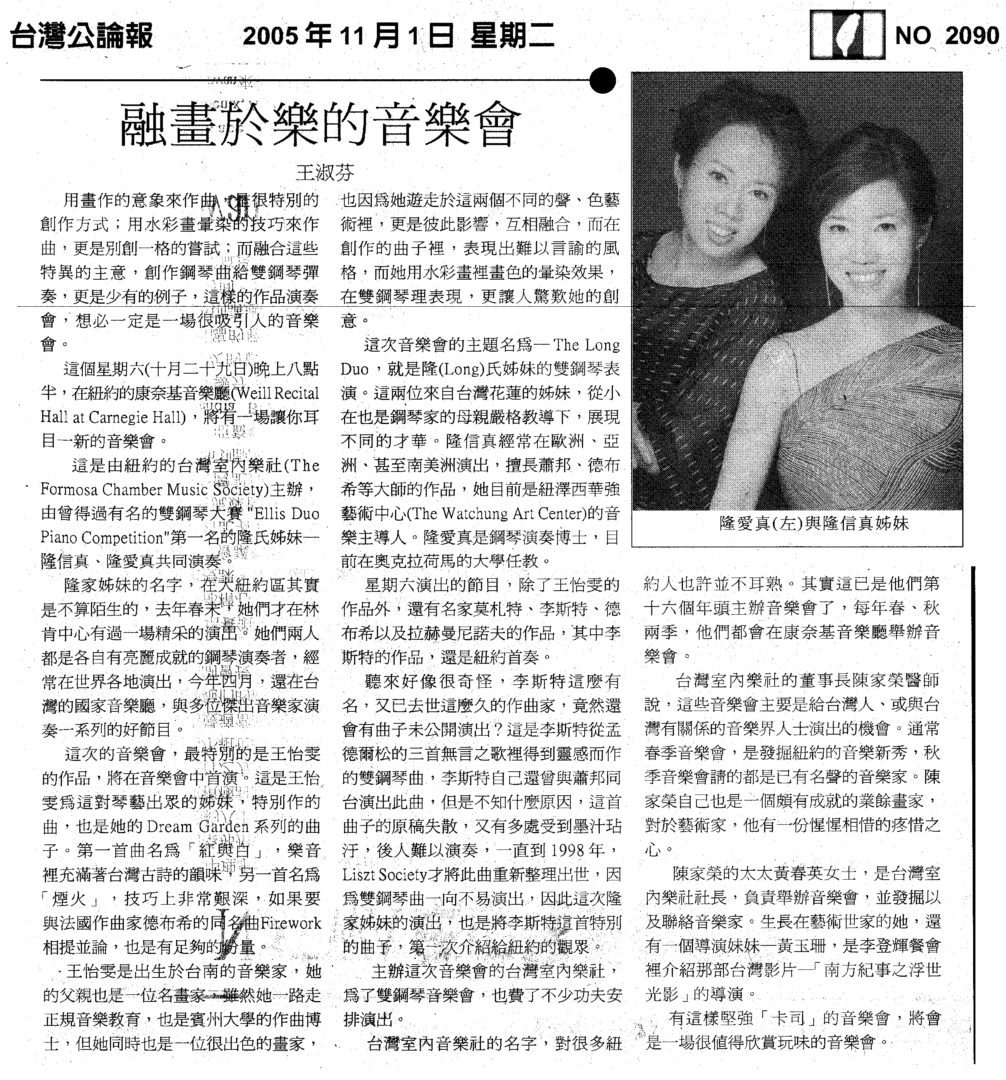 85. The Long Duo (雙鋼琴演奏會) BY Formosa Chamber Music Society (台灣室內樂社), New York, NY on 10/29/2005