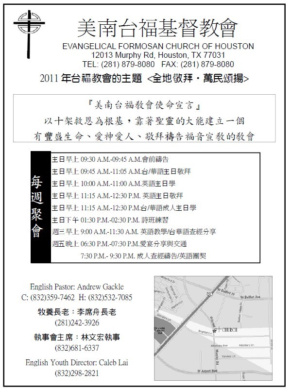 Evangelical Formosan Church of Houston 休士頓美南台福基督教會 May 17, 2016 Admin3 Evangelical Formosan Church 休士頓美南台福基督教會 Evangelical Formosan Church of Houston http://www.houstonefc.org/