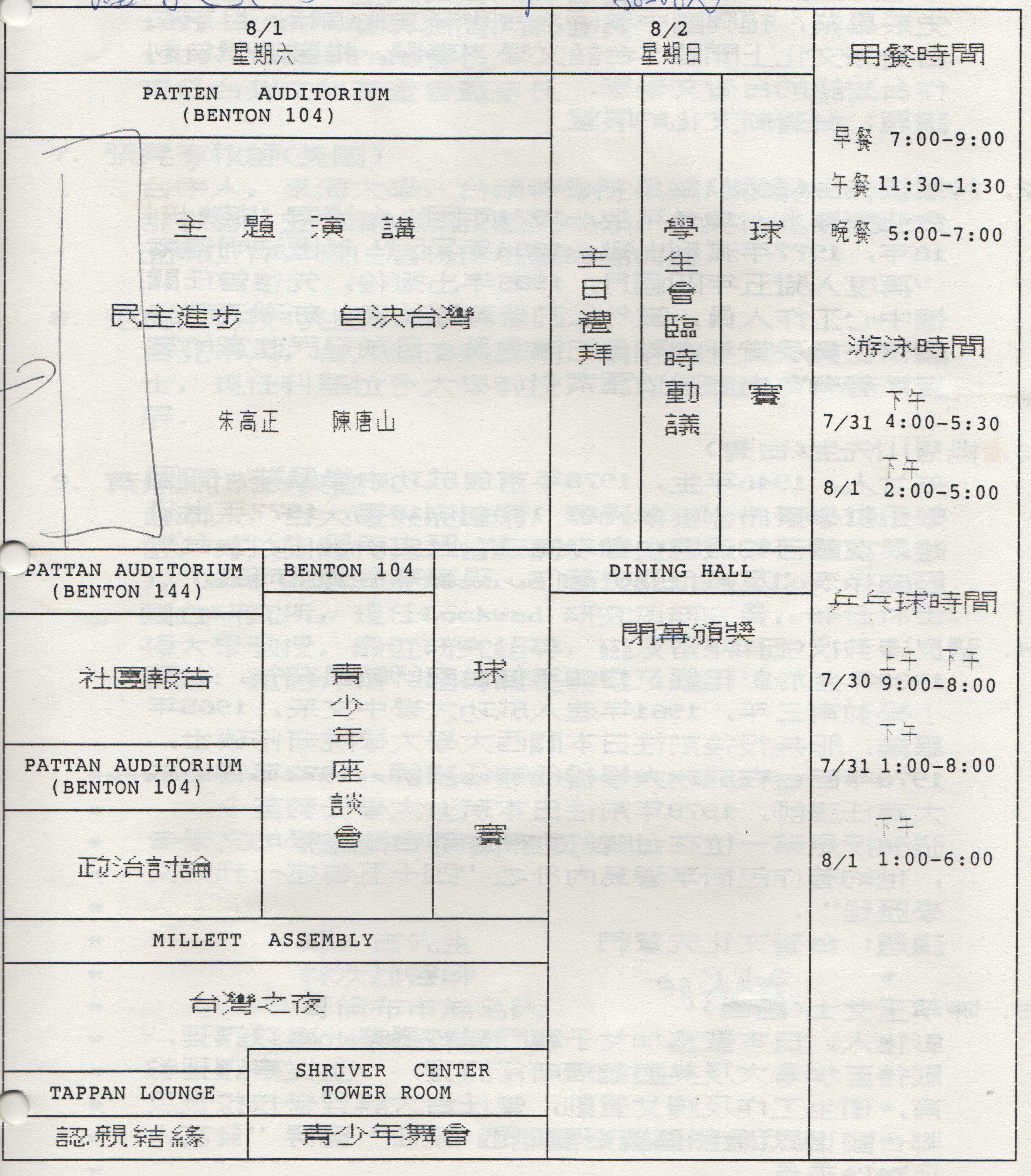 ▲在大會進行期間,邁阿密大學校園正舉行世界射箭比賽,台灣及中國均派隊參加。據說,在台灣隊前來之前卽已獲知中西部台灣人夏令會在此舉行;「有關單位」已經告訴教練如何應付。因此,當記者前去和他們打招呼時,敎練卽搬出所謂「不要搞政治了」、「不要像許信良那樣破壞國內團結」 等話,讓人感慨在千里之外遇到同一故鄕來的人,竟不能開懷閒談,彼此問候,國民黨統治及敎育的方式之沒有人性實不難想像。
