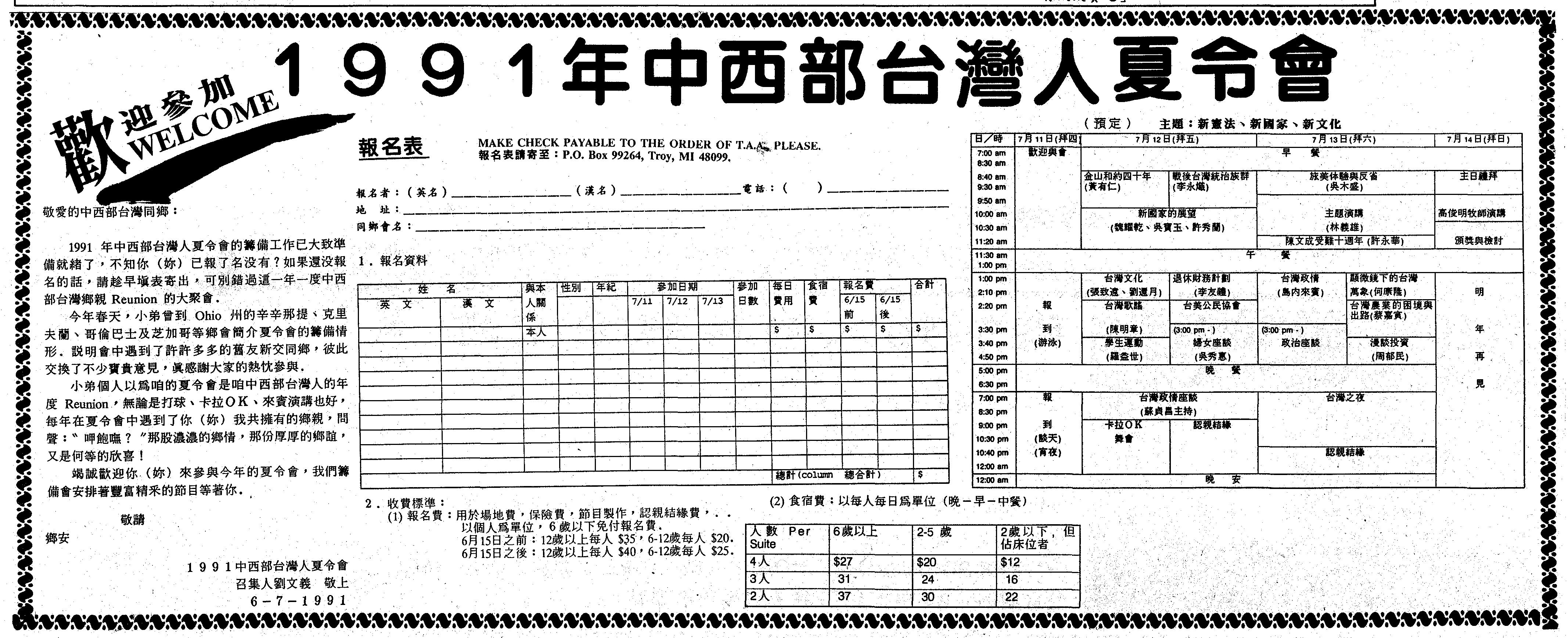 【安雅堡訊】1991年美中西部台灣人夏令會定於七月十一日至十四日假 Central Michigan University舉行。今年的主題爲「新憲法、新文化、 新國家」,林義雄、蘇貞昌、李鴻禧、黃有仁等海内外知名人士將應邀演講。夏令會節目已大致安排妥當。七月十一日辦理報到,交誼談天。七月十二日上午有黃有仁的「舊金山和約四十週年説明會 」及李永熾的「台灣史介紹」;魏耀乾、吳寶玉、 許秀蘭談「新國家的展望 」;下午張致遠、劉還月將主持「台灣文化」座談; 李友禮講「退休財務計劃 」;陳明章解説「台灣歌謠」;羅益世談「學生運動」;吳秀惠與李鴻禧分別主持「婦女座談」。及「台語座談」;當晚有舞會、認親結緣活動。七月十三日上午吳木盛要與鄉親分享「族美体驗與反省 」,然後由林義雄與蘇貞昌作專題演講:下午則由島内來賓談台灣政情;另有何康隆的「顯微鏡下的台灣萬象」、蔡嘉寅的「台灣農業的困境與出路」以及周郁民的「漫談投資」;晚上是精彩的「台灣之夜」。七月十四日上午許永華將主持陳文成受難十週年紀念會,高俊明牧師將應邀演講。午餐後即散會。