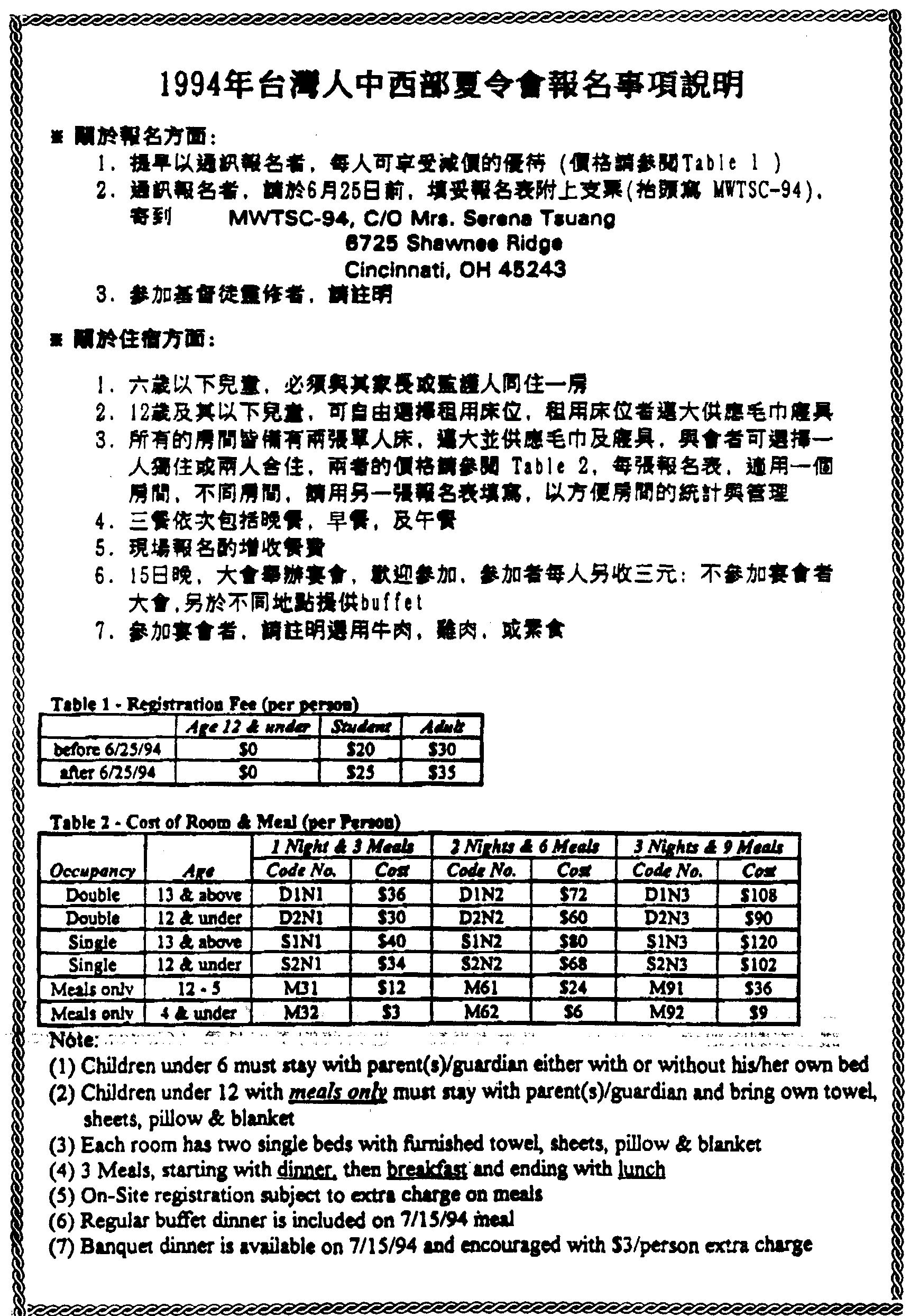 報名詳情請看第七版 「台灣人中西部夏令會報名事項説明」。報名單及有關細節請洽Serena Tsuang,電話:513-831-8734,傳眞:513-421-8188。