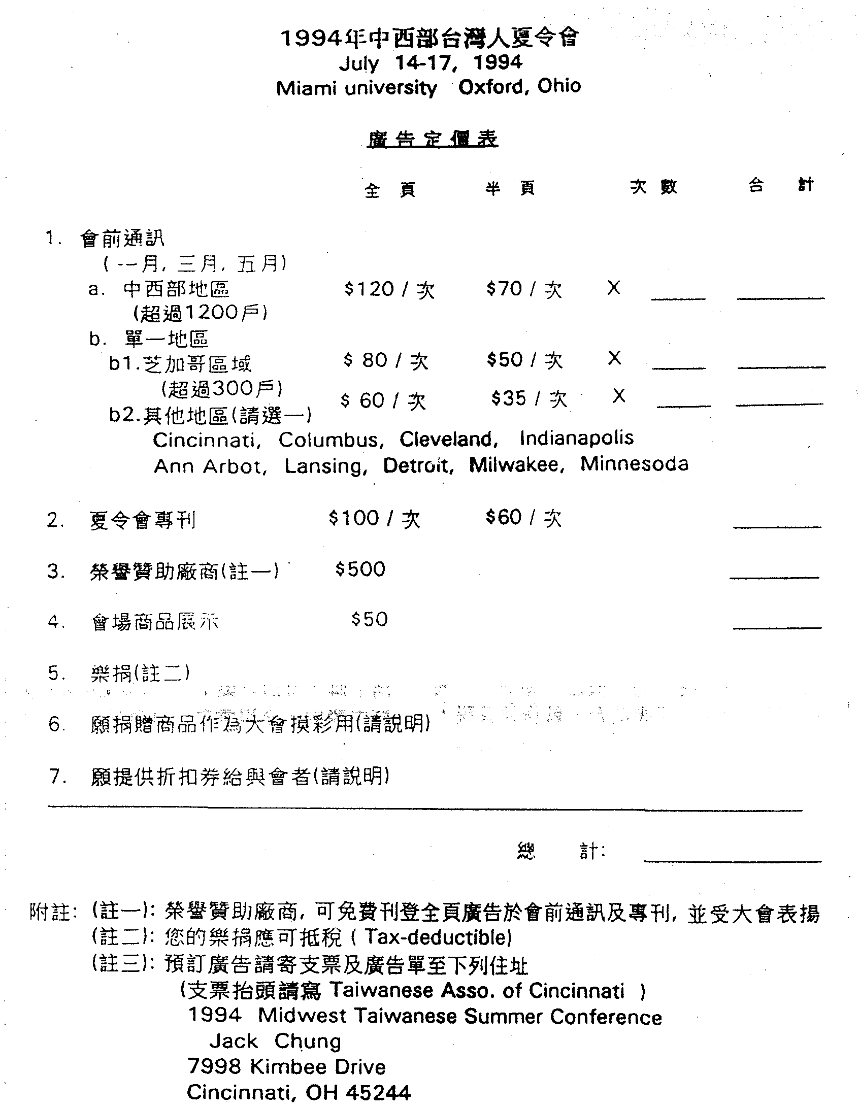 1994年的中西部夏令會將由辛辛那堤台灣同鄉會主辦,我們誠懇地 徵求您的廣告贊助,支持與參與。