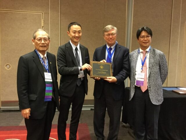 照片4: 美國油脂化學會第一届‘侯景滄生物科技獎’ 頒獎典禮. 由生物科技組主席 Jun Ogawa 教授 (右1) 以及獎金贊助者日本 Nitto 藥廠的代表 Kohey Kitao (左2) 共同頒獎給予Thomas McKeon。侯景滄(左1)觀禮.