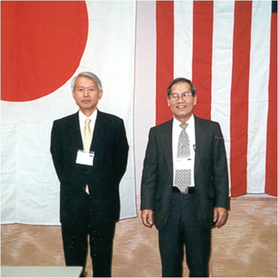 照片3:1999年美國、日本食品與農業合作委員會於東京與日本代表團團長谷口肇在 兩國國旗下合影。