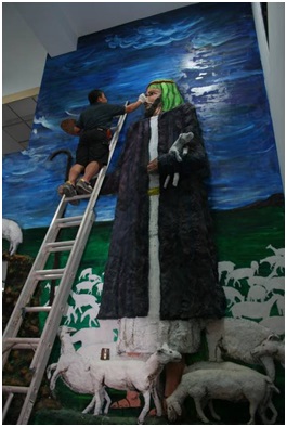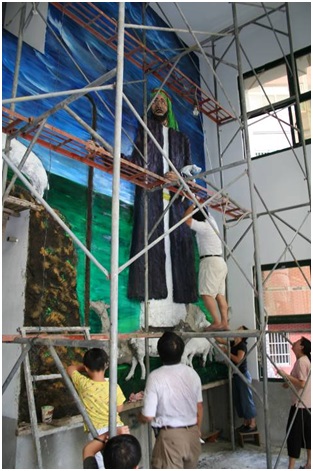 李牧師:「好的,來談一個令我終身難忘的經驗吧!當我在鹿港教會牧會時與隔壁村的和美長老教會李啟耀牧師算是舊識,牧師娘是我們小時候在教會的大姊姊,因此也頗受李牧師夫婦的關心照顧。在那期間和美教會禮拜堂正在重建,快要完成前一年李牧師有一天特別來找我,說有事情問我。他說禮拜堂入口有一堵牆高約20呎,而且不是一整個平面,造型有點像倒『卜』,問我該怎麼辦。我講了一大堆想法他還是有點霧煞煞的!後來我就乾脆用路加福音15章耶穌說的迷途羔羊畫了一幅百羊圖然後與他們解釋如何做,他們總算似懂非懂的拿著我的油畫去找人估價,結果在彰化沿海民間宗教盛行的地區來的都是蓋廟師傅。後來他們又回頭找我說『頭剃下去了,你要負責!』後來我才知道他們擔心這個浮雕若是讓蓋廟師傅來做耶穌可能就變佛祖了!我只好硬著頭皮答應,在工作之餘去幫他們進行這個我的大型浮雕處女座。以前在家裡幫父親工作的所有的經驗、感覺這個時候通通跑出來了!這個浮雕必須在鷹架上登高攀頂,他們說我好像在登山一樣,可能鷹架拿走我就變攀岩了吧!?工程進行大約四個多月,時常要挑燈夜戰,和美教會的牧師、長老、同工只好陪著我,大概怕我掉下來吧?李啟耀牧師第一次手工混水泥;建築水泥工人自告奮勇地幫我做水泥植筋,雖然他們的工作解決了我牢固的問題,但也帶來另一個問題,讓我的浮雕只好變成部分水泥雕塑,我還是謝謝他們的熱心參與;鋁門窗包商也興趣沖沖來參一腳,我很快樂的拿起相機一一幫他們拍照;教會的幹事、青年、牧師的孩子、長老、小朋友都想要參與油畫的上色,我當然歡迎,看他們興高采烈的畫,還蠻有趣的!有教會的人問我『藝術家都很不喜歡人家碰他的作品,李牧師為甚麼願意讓他們動手?』其實,對我來說,藝術是一種生活,更何況這個作品不是單純的藝術作品,他是為信仰而做,是為教會而做,教會就是人與人、人與上帝的關係。是大家的事,與敬拜上帝的事。讓這些教會的人參與,將來他們進到教會來看到這個作品心裡一定會說『這個我也有分』,那些非基督徒的包商、工人經過教會一定會想這個教會有我做過的作品。另外還有一件事特別要提的,李啟耀牧師原本有懼高症,他除了第一次混水泥、還第一次畫油畫、更大的事是有一天他竟然開口問『可不可以讓我爬上去畫』我非常的高興,因他的敬虔,增加了他的信心更突破了心理的障礙,更上一層樓了!感謝主!」這個難得的經驗見證了為榮耀主名,兄弟姐妹的同心協力與排除萬難的美事。