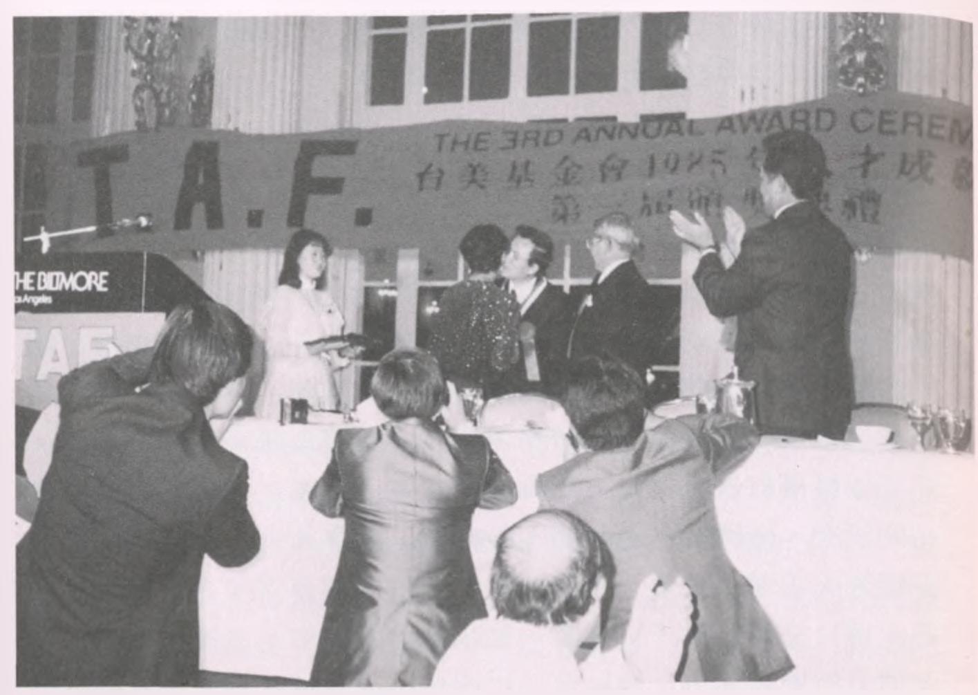我的生命際遇一而再、再而三地如此幸運。就在我心情沉重,感覺像隻鬥敗的公雞準備孤獨無助地離開D.C.時,守護天使再度出現。我獲知自己得到「台美基金會」1986年「科技人才成就獎」。「台美基金會」由王桂榮和王賽美於1982年在美國加州洛杉磯成立,其宗旨乃「以獎掖並肯定海內外,不論出生地,關愛台灣、認同台灣爲故鄉的傑出人士」。當年,另一名得獎者是簡逸文教授。簡教授時任紐澤西州立大學藥理學系教授兼主任,爲美國醫藥科學院院士,對嗎啡解毒及干擾素之癌症治療,有卓特的研究,得獎實名副其實。至於我,在學術上,我的研究是有關蜥蜴的生殖生態學,毫無經濟實用的價値可言;在社會上,作爲一個公共知識份子,我是一個政府的眼中釘,並被列入「爲匪宣傳」的黑名單中。我自己心中明白,「台美基金會」勇敢地以「關愛台灣、認同台灣爲故鄉」的理由,以此「成就獎」來公開肯定、鼓勵我,讓正處生命窘境的我,倍感溫馨,十分感激;因此在卻之不恭、受之有愧下,我欣然參加了在洛杉磯舉行的盛大頒獎典禮。在這個典禮上,我也忍不住發表了一篇「面對台灣的未來」的講話;我也禁不住藉了這個機會,看著坐在底下的太太,說出了我內心的感受:「最後,我要特別感謝過去十年,與我共同背負苦樂的牽手,她不是在台灣出生的,但與我到台灣後,她努力學會說台灣話。她對台灣的感情、關心與熱愛,與在座的各位一樣。沒有她的支持與鼓勵,今晚我就無法站在這裡。」聽到如雷的掌聲,紅著眼眶,我看著她,爲她而驕傲。