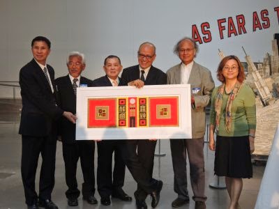自左至右:台美文藝協會理事陳秋貴、黃再添、陳隆豐與皇后區博物館館長Tom Finkelpearl、藝術家廖修平及策展人李美華合影於皇后區博物館。