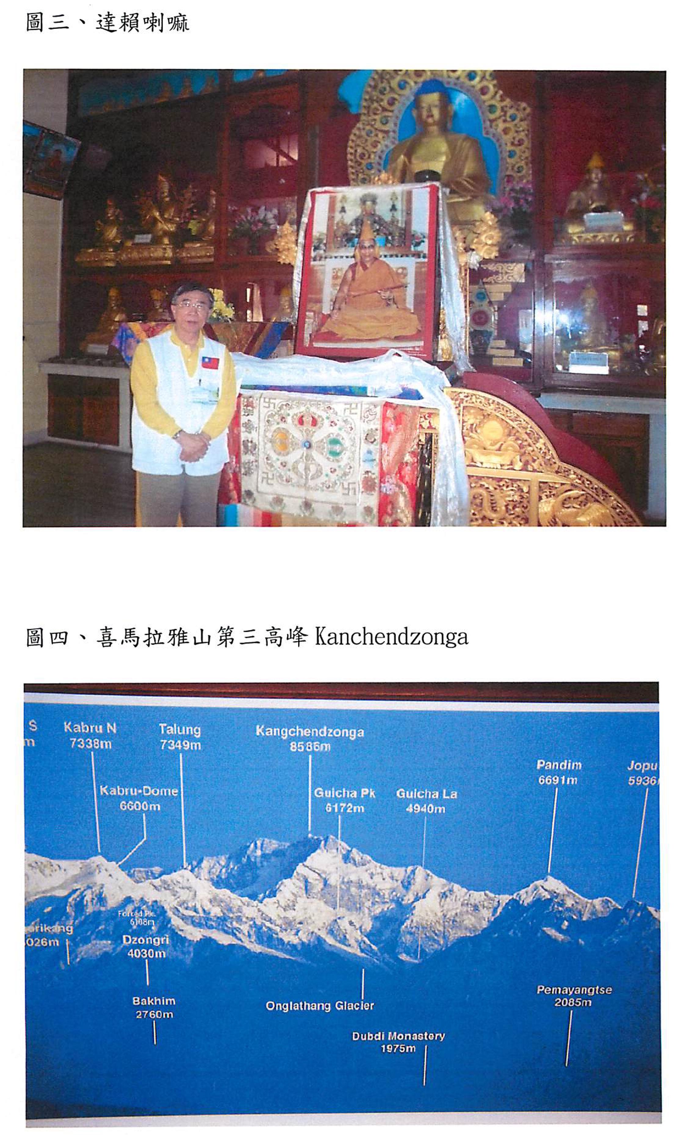 這次我的團隊有牙醫(1名)、内科(2名)、兒婦(各1名)、外科(1名)、 婦產科(1名)、藥師(1名)、護理師(2名)、行政助理(1名)、國小校長一名、再加上我及内人共14人(圖二),中午抵達印度Delhi機場。印度我們雖然來過二次,但對於機場人之多、事之雜,還是不甚習慣。因為我們的團行李很多,包括一小藥局的藥品及器材,在機場就被攔了下來,幸好團長臨機一動將被抽中檢查的急救包拿幾個送給驗關的人就0K了,團長說:每個包上都印有我們的單位名稱及國旗,由他們來幫我們宣傳也好。出了機場凱度頓珠先生(Khedroob Thondup,Dalai Lama胞兄之子)給我們每人彼上一條哈達,就開車直往市内藏人開的一小客棧。(這一路我們接受哈達,幾乎每一站服務過後藏胞就給我們一條,一路前前後後收集了十幾條),進到客棧客廳,第一個看到的是神龕上有一張相,相框外框圍著一白色哈達,上面的人物是藏胞的精神領袖達賴喇嘛,他是藏人的活佛,深得人民衷心愛載及膜拜,只是有點不習慣的是達賴帶著眼鏡(圖三)。佛祖帶著眼鏡倒是生平第一次看到。我合了掌,深深地鞠了一個躬,心裏有說不盡的感動。晚上在我國駐印度翁文祺代表官邸晚餐。
