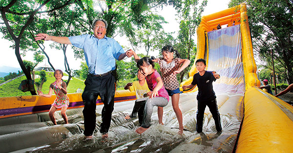 「很多人問我累不累?當然累呀!常常晚上回到家,手腳都不聽使喚了,但隔天一早,看到小孩天真的笑容,就好像所有的辛苦都值得了……。」揮汗如雨的他,話沒說完,又被孩子們簇擁著上了滑水道。