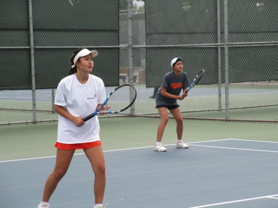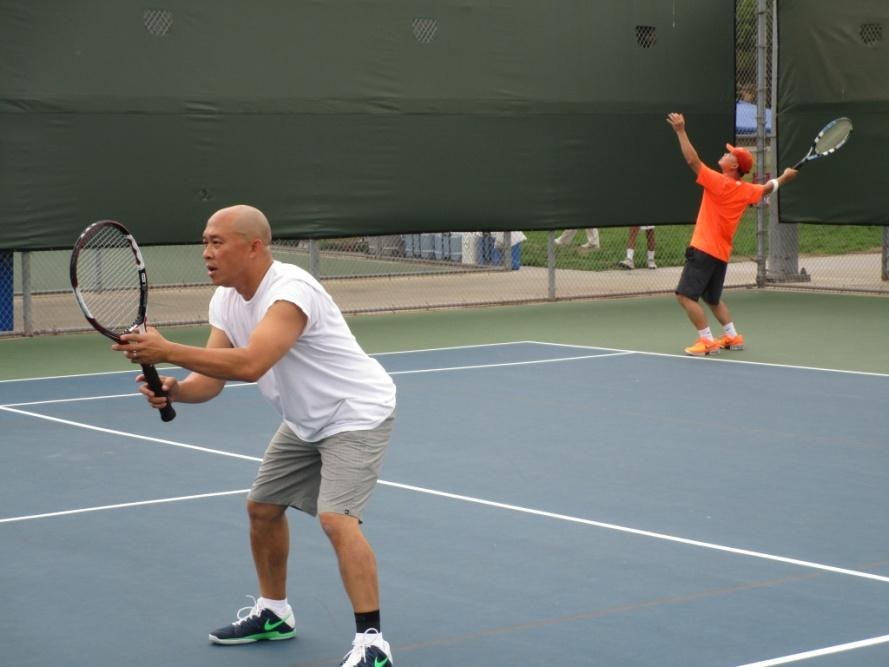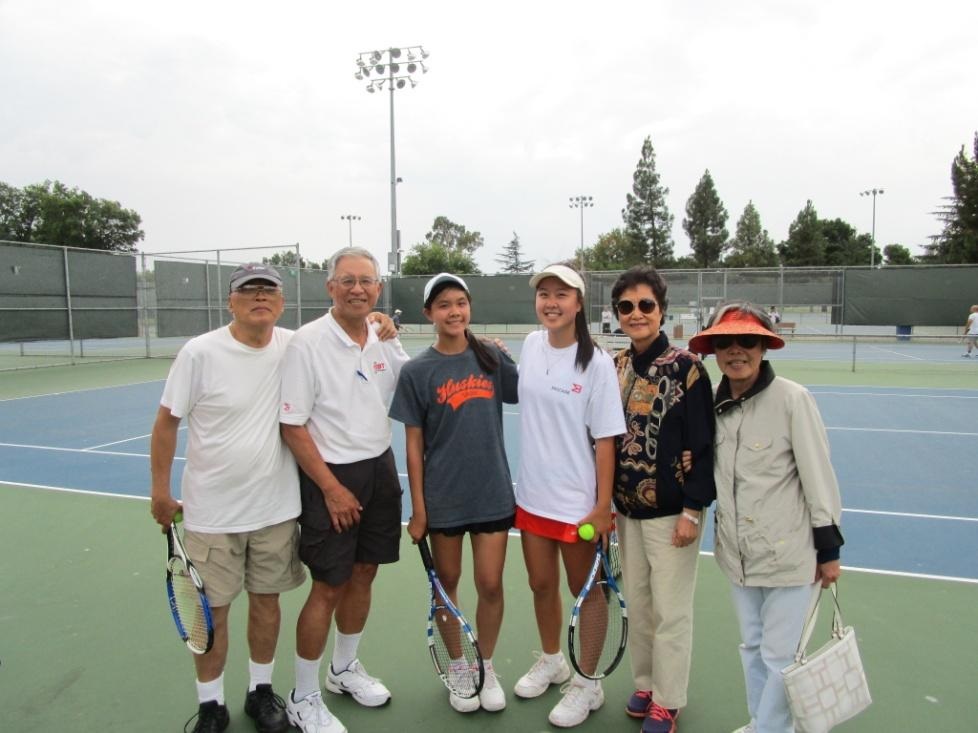今年Henry領導有方,徴招了十四球員。很難得的是他太太懷孕,預產日是網球比賽日之前後,但他還是照常負責組隊並參加練球。照片二是Henry与JoeLau対抗矽谷球隊,Henry穿橙色上衣,準備發球。這場比賽相當激烈,很可惜東灣隊以七比八輸給矽谷隊。今年球隊我家有七人參加(即:我、兩個兒子[Gene及Ivan]及女兒一家人[Lisa, Tom, Jamie and Katie])。兩位外孫女Jamie及Katie是高中的網球選手。在第一場的比賽,我和 Jamie 參加雙打,対手是東南隊的 Billy及 Ted Chen。他們兩人球打得好,也比較年青(大概是五十歲左右)。我們這邊是將近八十的阿公与孫女的搭擋。比賽進行一半,他們獲知我是近八十長輩,就少攻猛球。我們祖孫隊,是頭一次一起打雙打,想不到我們配合非常好,每一球我們都盡力反攻,使対方不能容易得分。結果以零比八輸掉。雖然吃鴨蛋,我很珍惜有機會能與大孫女參加這次比賽。她將於九月底離家去念大學。