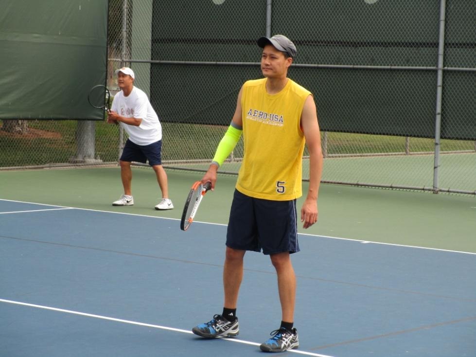 相片二:Henry与JoeLau対抗矽谷球隊,Henry穿橙色上衣,準備發球。