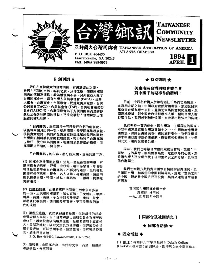 Taiwanese Community Newsletter of Atlanta Taiwanese American Association (ATAA) 亞特蘭大台灣鄉訊