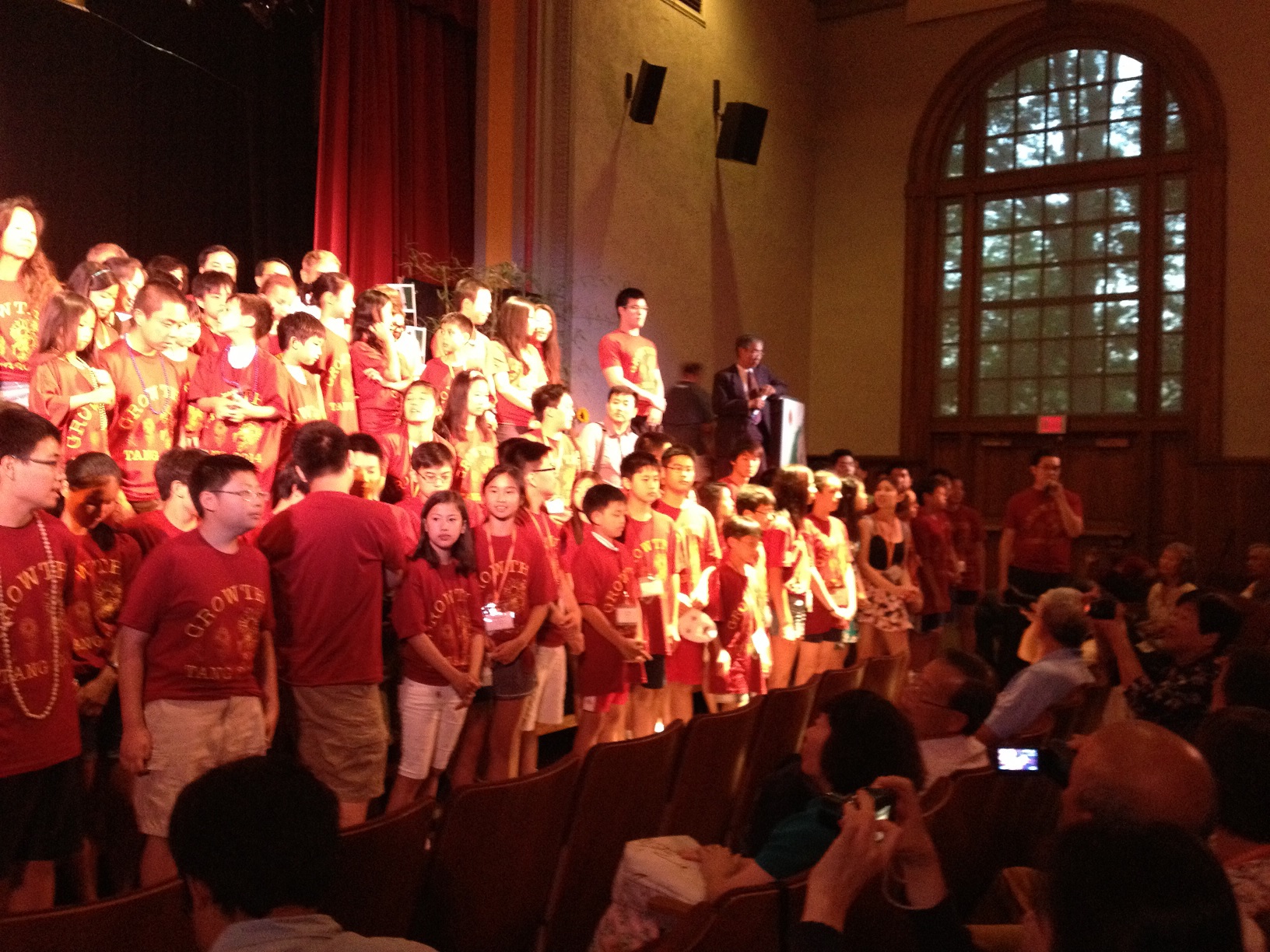 更加感人的畫面出現在謝幕,TANG的負責人 Goodwin Chen 邀請全部演員上台,130 位亮麗的第二代寶貝 在熱烈掌聲中列隊舞台。接下來,Goodwin Chen 邀請所有的阿公、阿嬤通通上台接受表揚。於是老、中、青三代站滿舞台,展示台美人難得一見的幸福家庭團聚。以前父母帶兒女來夏令會,現在兒女成家帶她們的兒女。也因為孫兒女参加,阿公、阿嬤專程而來,有些來自加州和中西部,今夜同台接受表揚,受到大會肯定讚美,不僅實至名歸也是理所當然。