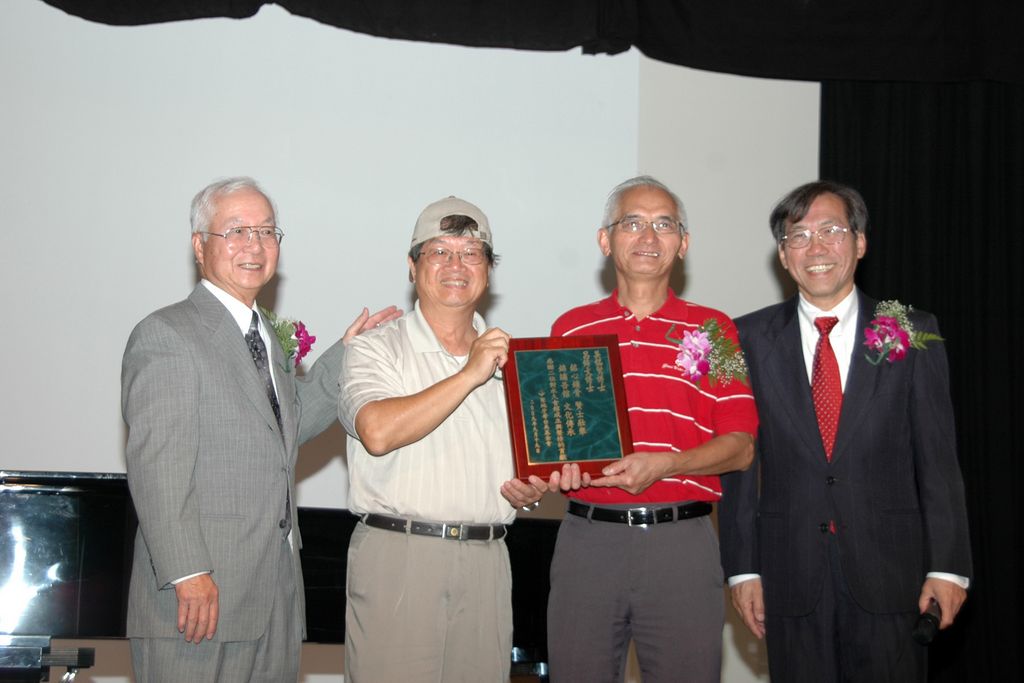 陳坤木董事長(左一),范少達主任(右一)頒獎給建館功不可沒的吳銘賢(左二)和呂錦文(右二)