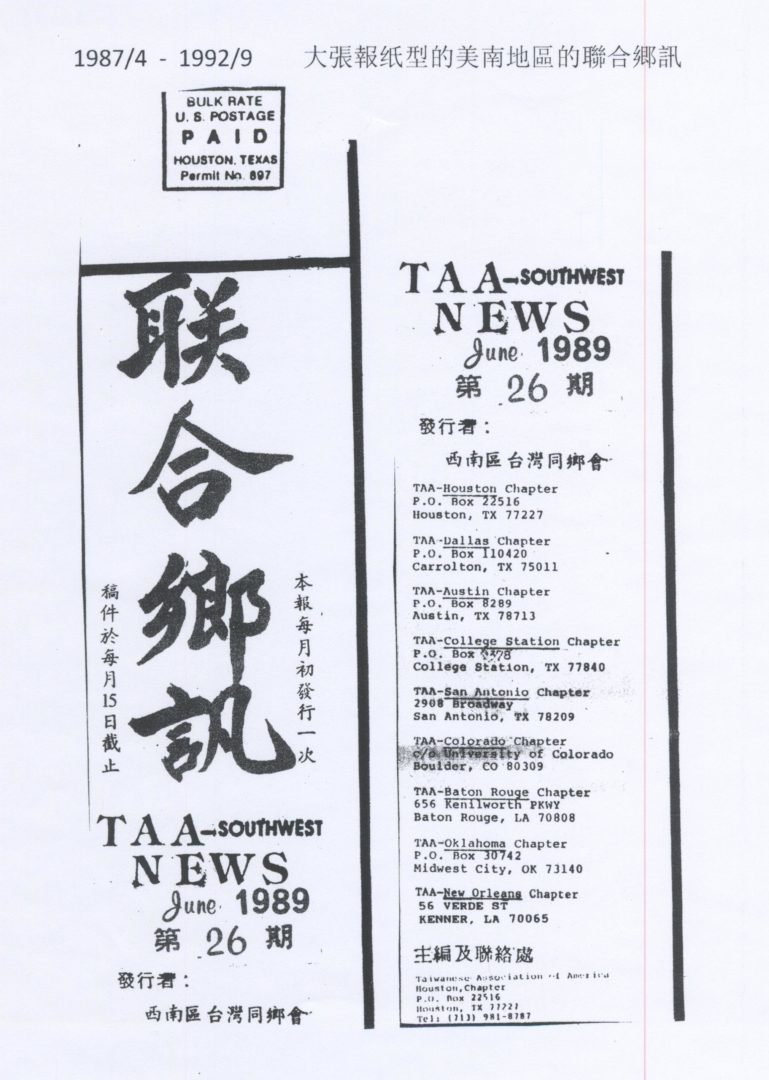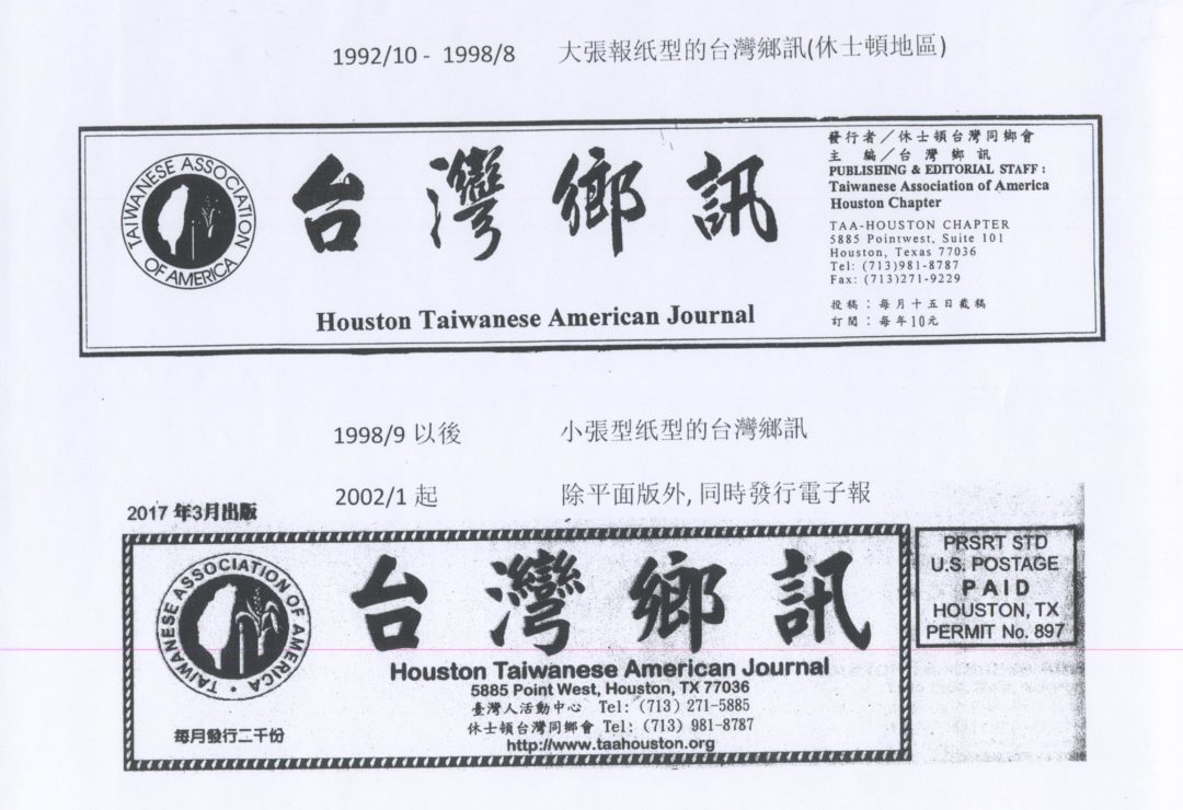 台灣鄉訊:還是维持大張報紙型,只報導大休士頓地區的新聞,活動和論述文章。從一九九二年十月到一九九八年八月為止,一共發行七十一期。