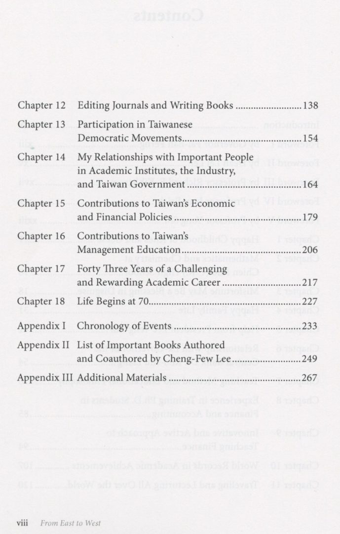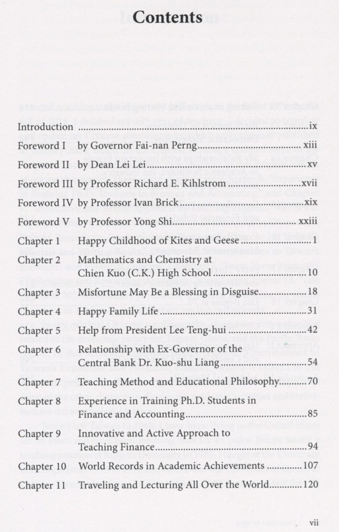 I started teaching at the University of Georgia in the fall of 1973. In the fall of 2016, I finished my 43rd year of teaching. I decided to translate and update my Chinese autobiography, which was originally published in January 2000. Based on the Chinese edition, I updated some of the chapters. I have also added seven new chapters in this English edition of my autobiography. These seven chapters are: Chapter 8, ^Experience in Training Ph.D. Students in Finance and Accounting,” and Chapter 9, “Innovative and Active Approach to Teaching Finance,” which was expanded from Chapter 7 of my Chinese autobiography; Chapter 10, “World Records in Academic Achievements,” Chapter 12, “Editing Journals and Writing Books,” Chapter 15, “Contributions to Taiwan’s Economic and Financial Policies,” Chapter 17, “Forty Three Years of a Challenging and Rewarding Academic Career,” and Chapter 18, “Life Begins at 70.,J These topics present my academic achievements, review my career in academia, and reflect on my life, respectively.