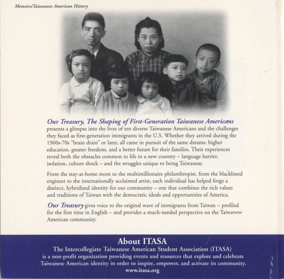 From the stay-at-home mom to the multimillionaire philanthropist, from the blacklisted engineer to the internationally acclaimed artist, each individual has helped forge a distinct, hybridized identity for our community – one that combines the rich values and traditions of Taiwan with the democratic ideals and opportunities of America. Our Treasury gives voice to the original wave of immigrants from Taiwan – profiled for the first time in English – and provides a much-needed perspective on the Taiwanese American community.