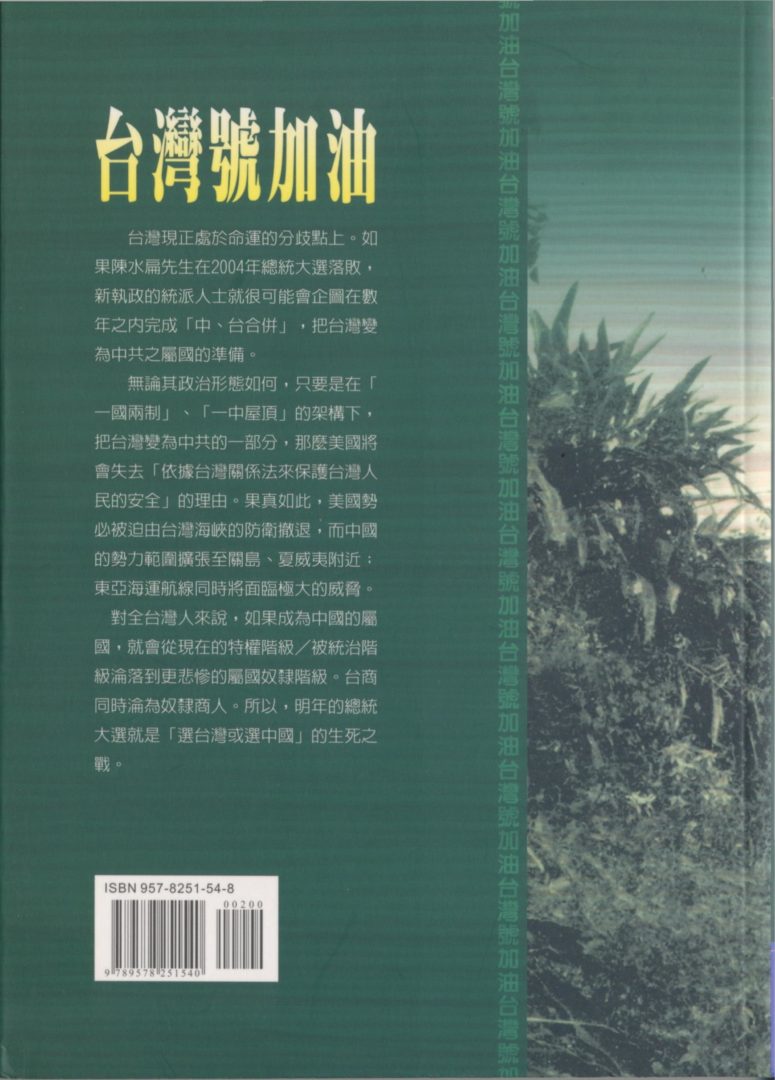 台灣現在正處於命運的分歧點上。如果陳水扁先生在2004年的總統大選落敗,新執政的統派人士就很可能會企圖在數年之內完成「中、台合併」,把台灣變爲中國之屬國的準備。