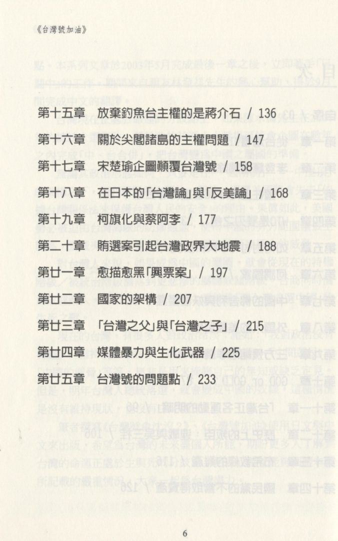 在後續的《台灣號加油》系列裡,筆者把記事的主旨由以前「揭發台灣的黑暗面貌」轉移以「台灣的時事評論與分析」爲重點。本系列文章於2003年5月完成最後一章之後,立即著手「日翻中」的工作。期間來自親友林發祥先生的熱心幫助,得於9月間完成中文的翻譯。