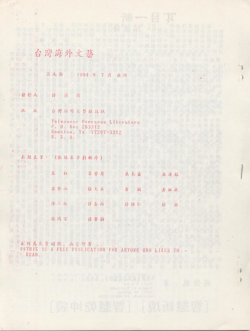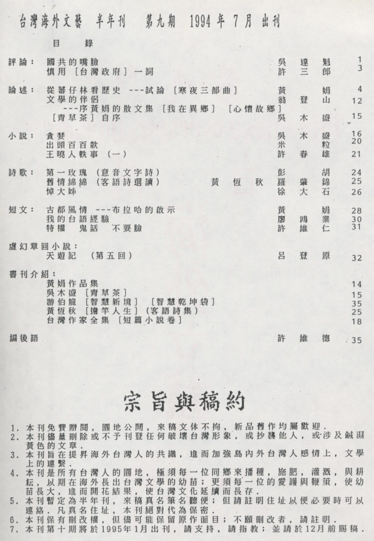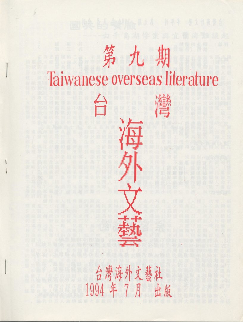 Taiwanese Overseas Literature 台灣海外文藝 April 20, 2016 user 09. Magazines Collected : #9(07/1994) ~ #14(11/1999), #17(12/2003) Donated by Dr. M. Ou 05/2017 Posted in 05/2017 海外文藝 Source from 台灣公論報 / 07/03/1989 Posted in 04/2016
