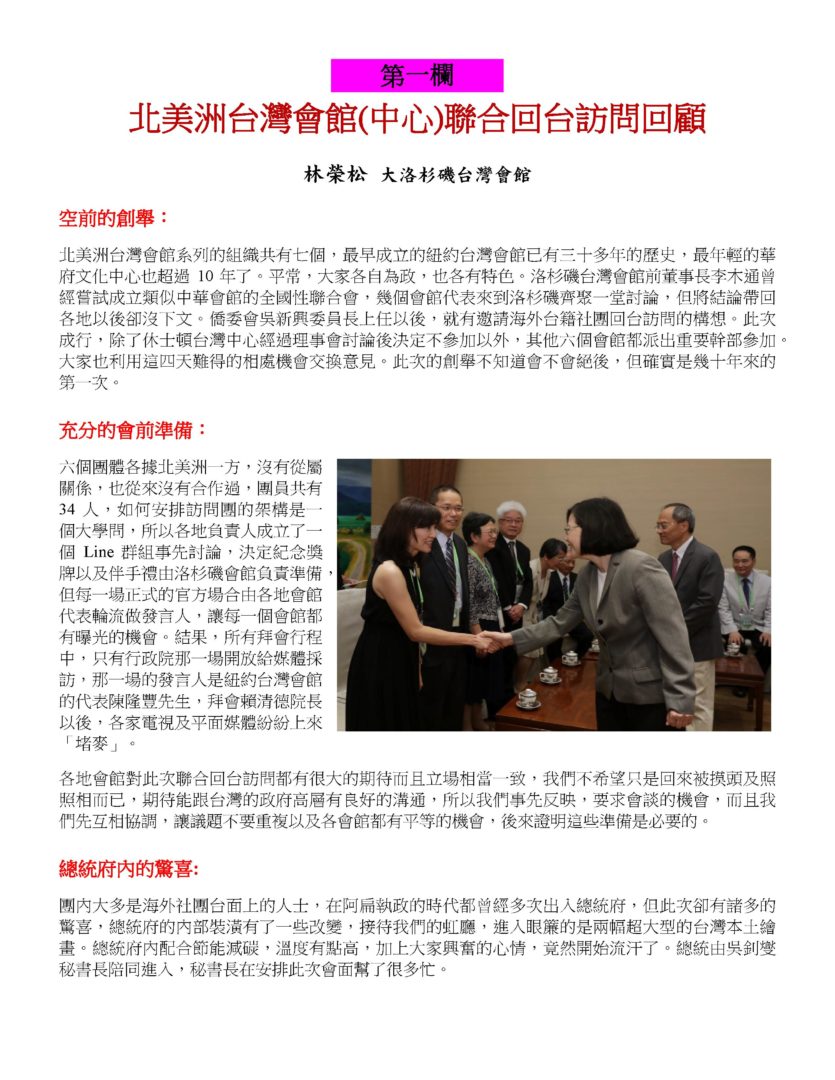 訪賓一行包括大洛杉磯臺灣會館董事長林榮松、紐約臺灣會館理事陳隆豐、北加州臺灣會館理事長陳德輝、聖地牙哥臺灣中心董事長杜武青、臺加文化協會前理事長廖純如、華府臺灣文化中心理事長黃泰郎等,由僑務委員會委員長吳新興陪同,前來總統府晉見總統,總統府秘書長吳釗燮亦在座。