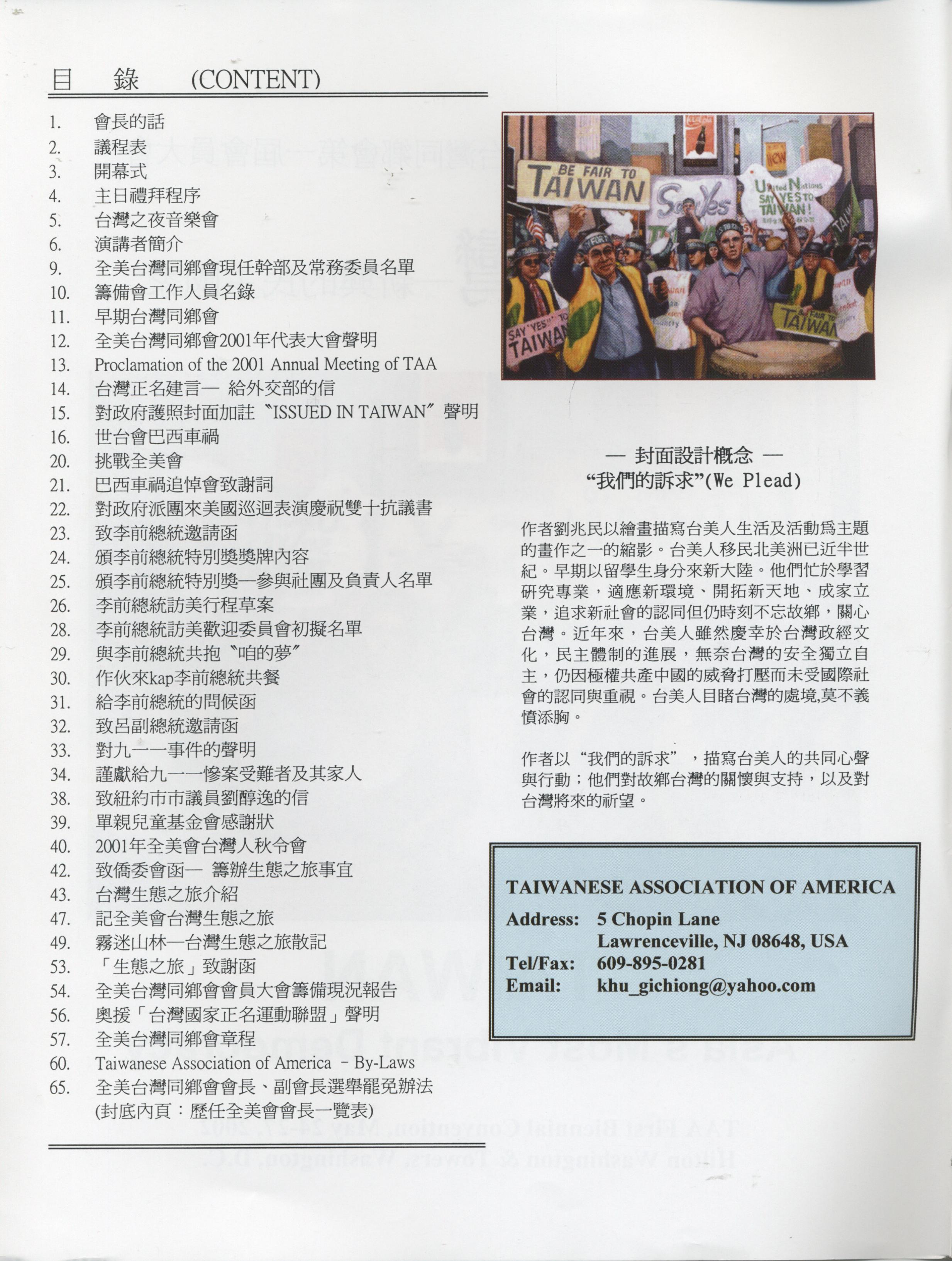 全美台灣同鄕會的組成有三層重要的目的:一、促進故鄕台灣的進步、繁榮與安全;二、保障台美人及旅美台灣人的權益;三、促進台美間的文化交流。我們希望在本屆及將來的年會中能以這幾個目的為主軸進行討論。