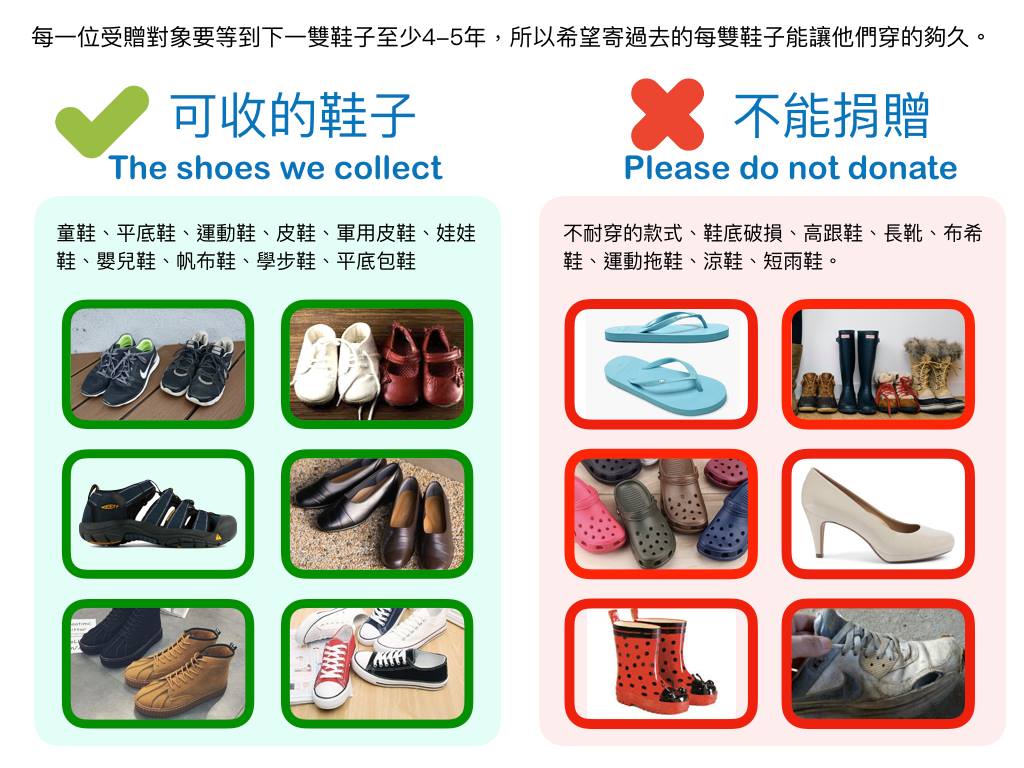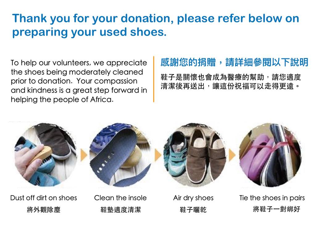 - 鞋子內外要洗乾淨,用繩子一雙一雙綁好。我們無法收集已經破損,有異味,不堪使用的鞋子。