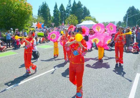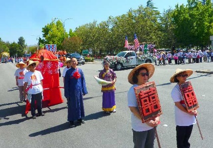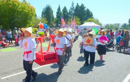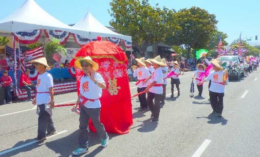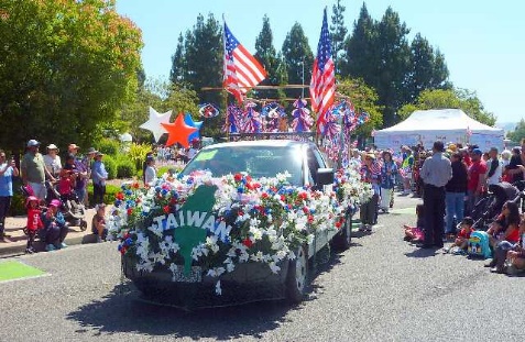 今年July 4th   美國獨立243週年,北加州台灣同鄉聯合會再次組團參與在Fremont (佛利蒙) 市Midtown舉辦的慶祝遊行。總共超過80團體報名參加。约90台美人參加聯合會的隊伍,主辦單位介紹我們是今年所有遊行團體中, 最壯觀的團隊。我們的花車以紅、白、藍康乃韾花朶為主,白百合為補佈置,加上木製綠色的臺灣地圖模型及名字,應景慶祝美國生日。今年遊行隊伍以台灣傳統婚禮花轎迎娶的大陣仗,新郎和媒婆帶領花轎,挑擔的彩禮,加上迎親儀隊、音樂、大鼓, 沿路熱鬧非凡地迎接新娘, 介紹及分享台灣的文化。其餘隊伍人員穿著July 4th的上身背心,戴著台灣斗笠,穿著拿著美國國旗向觀衆揮手致意,同慶美國獨立日。沿途上萬觀衆夾道歡呼,當我們的隊伍經過看台時,主辦單位大聲介紹台灣是個自由、民主的國家。此活動用較少的資源彰顕台美人重視參與及投入美國主流社會裏的活動,也很有效地讓美國主流社會人士多加認識台灣的存在、提高台灣在國際上的能見度及地位。
