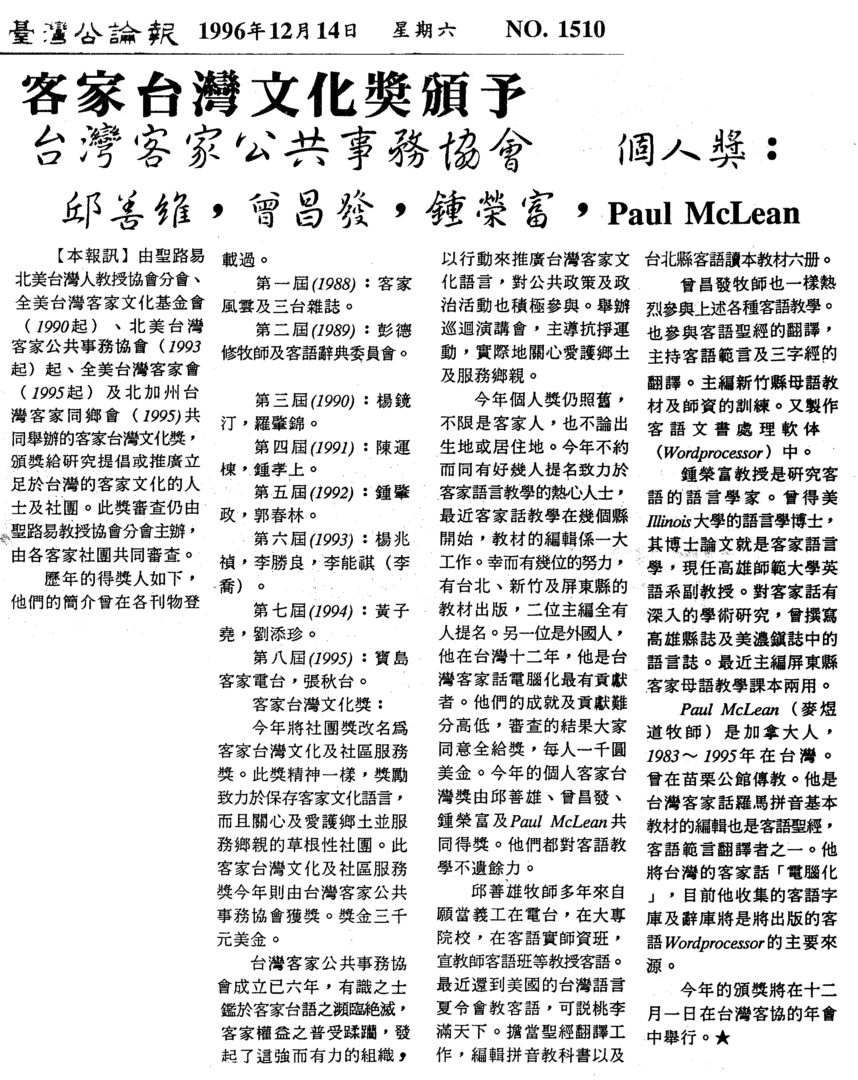 Source from Taiwan Tribune 台灣公論報 Issues 1510, 12/14/1996