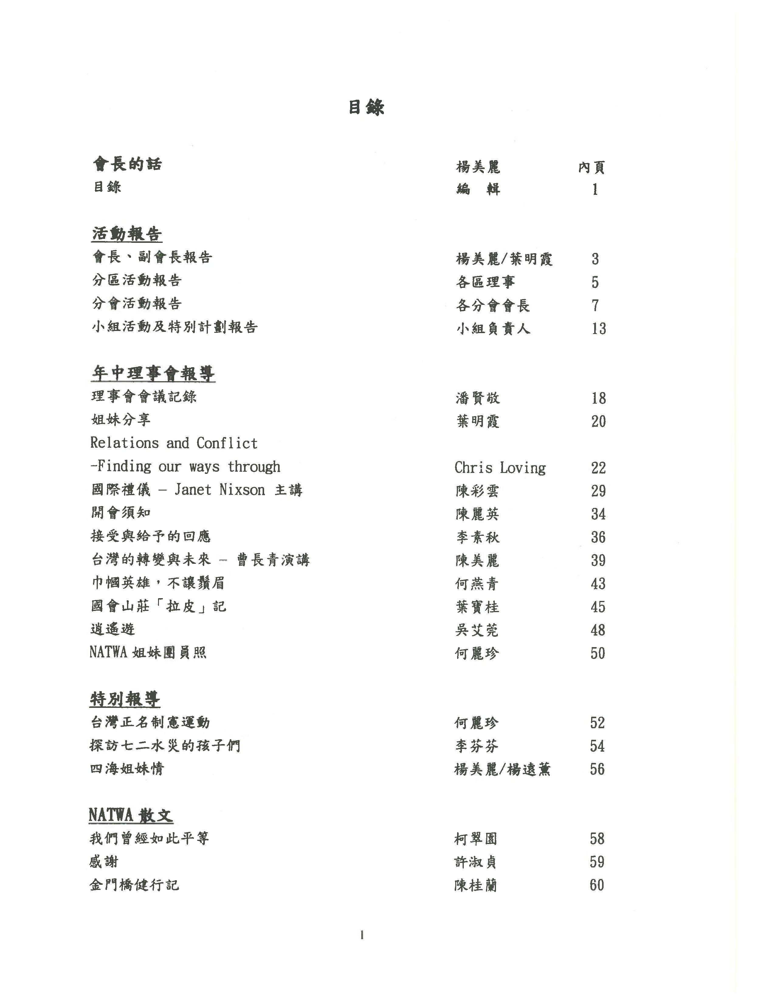 謝謝遠薰精心編輯這期的聯誼通訊!也感謝前會長葉寶桂不時的指點,副會長葉明霞、秘書潘賢敬、會計張淑嫻、公關何燕青、各理事及分會長、各組工作人員的打拼,以及各位姊妹的支持。藉此與大家分享“NATWA精神”,並簡單解釋NATWA年度會費運作及會員資料和網頁的改進,同時祝福姊妹們在新的一年,一切平安順利。