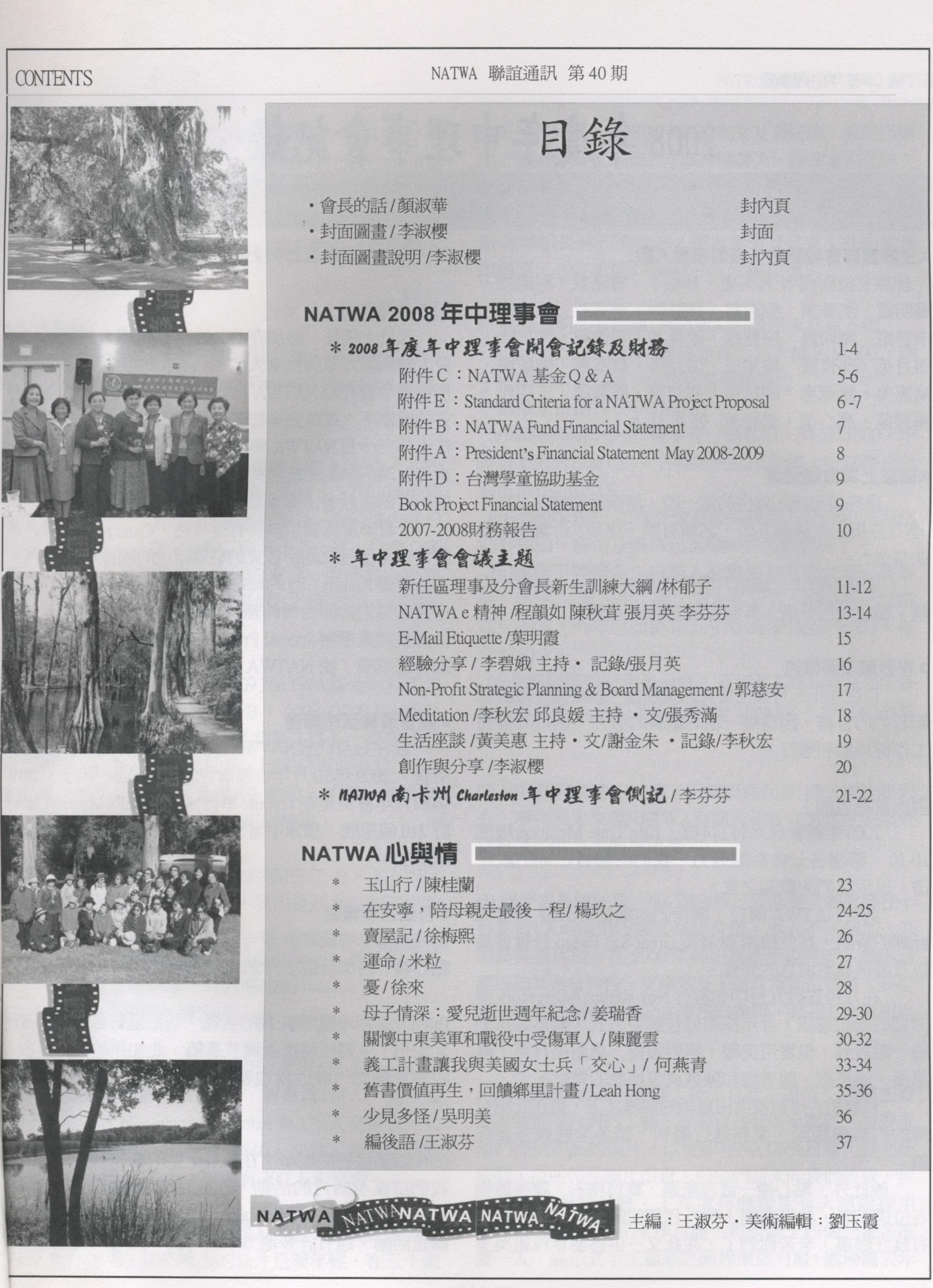 感謝王淑芬姊妹替咱編了這第四十期的聯誼通訊。她 是頂港有名聲、下港通京城的“辣媽”與“番 婆”,在百忙中鼎力相助令人感動,同時咱也要多 謝李淑櫻姊妹免料提供她的精美畫作作爲咱這一期通 訊的封面,要說聲感謝的姊妹真是多得不勝枚舉,咱 e秘書玲玲與碧娥真是好人作到底,請您們好好珍惜 這本精禾的Publication。