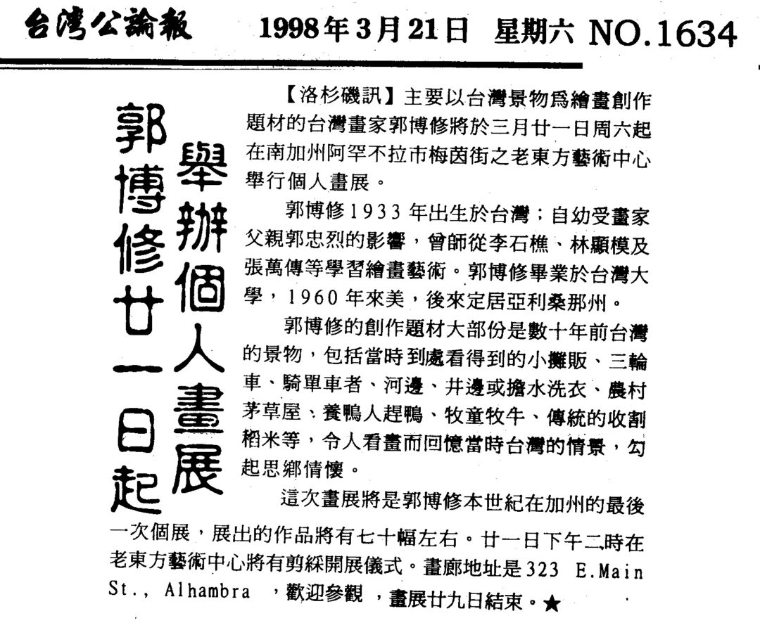 這次畫展將是郭博修本世紀在加州的最後一次個展,展出的作品將有七十幅左右。廿一日下午二時在老東方藝術中心將有剪綵開展儀式。畫廊地址是323 E. Main St., Alhambra,歡迎參觀,畫展廿九日結束。★