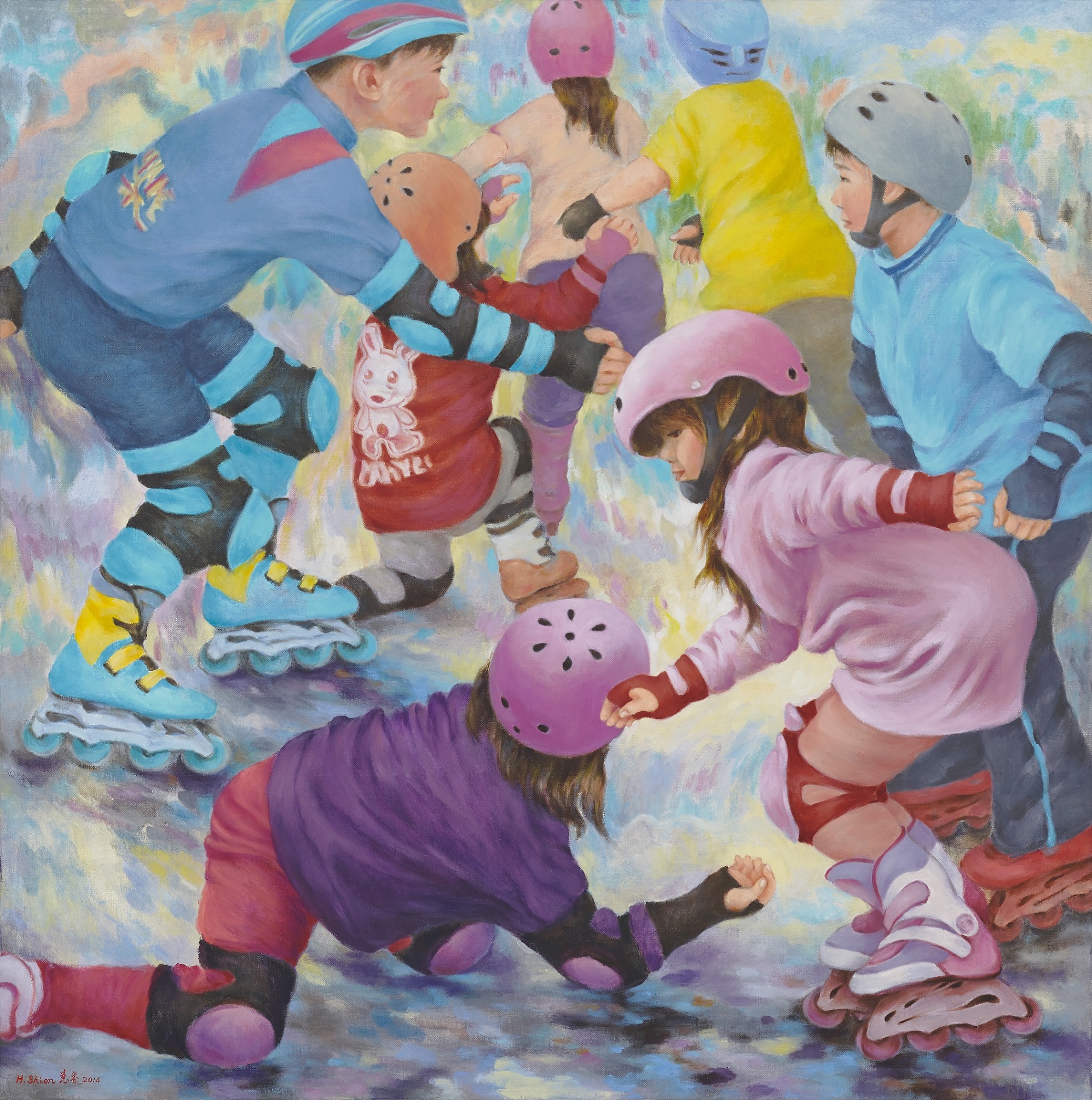 Huai Shion’s works are inspired by the people and events that surround her. Her recent works feature “people” as the theme. She is inspired by her from attachment to her homeland, Taiwan, and the emotional interactions between the people of Taiwan. Huai Shion also excels that using children as the theme in her paintings, depicting their innocence, purity and happiness, creating a more perfect world. In her heart, she hopes the world can be a little more pure and a little less complicated.