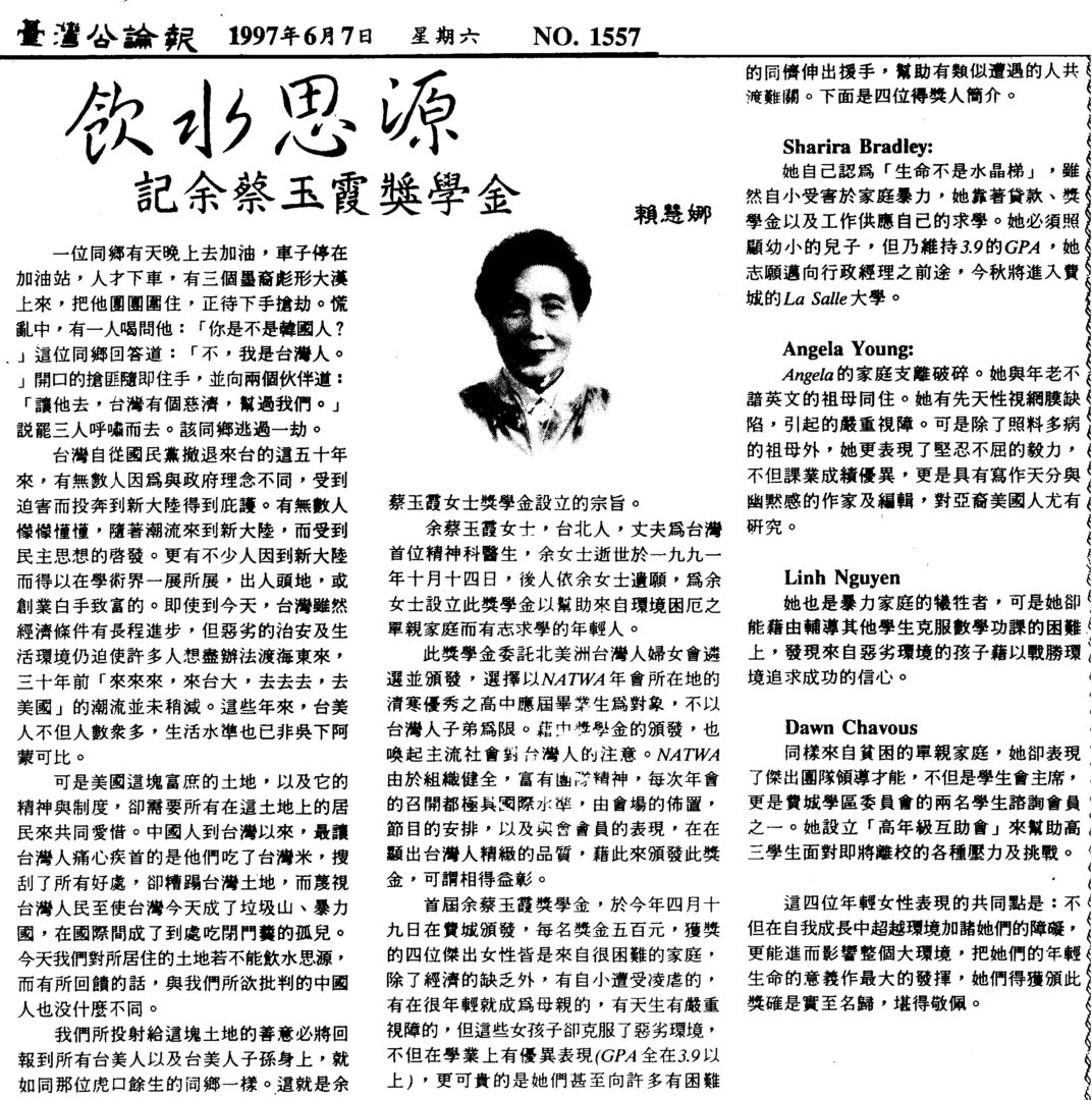 77. 余蔡玉霞女士獎學金 February 16, 2017 Admin1 01. Awards Offered by T.A. Individuals and Organizations Source from Taiwan Tribune Issues 1557, 06/07/1997 Posted in 02/2017