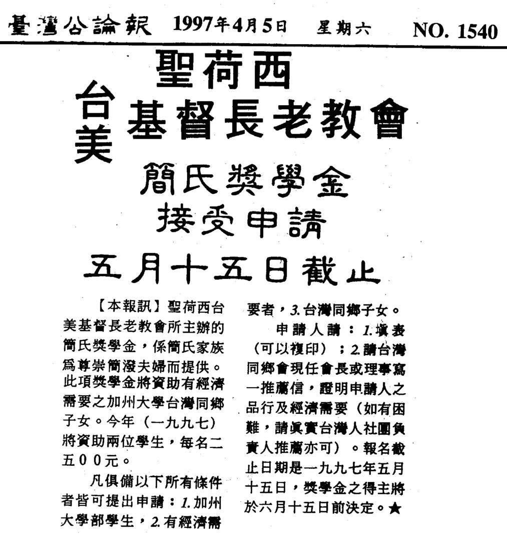 77. 簡氏獎學金 February 16, 2017 Admin1 01. Awards Offered by T.A. Individuals and Organizations Source from Taiwan Tribune Issues 1540, 04/05/1997 Posted in 02/2017