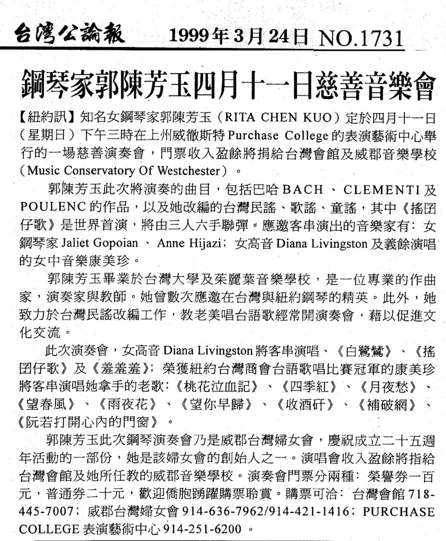 111. 郭陳芳玉慈善演奏會 by 威郡台灣婦女會, Purchase, NY on 04/11/1999 November 13, 2017 Admin1 Musical Concerts Source from Taiwan Tribune Issue No. 1731, 03/24/1999 Posted in 11/2017