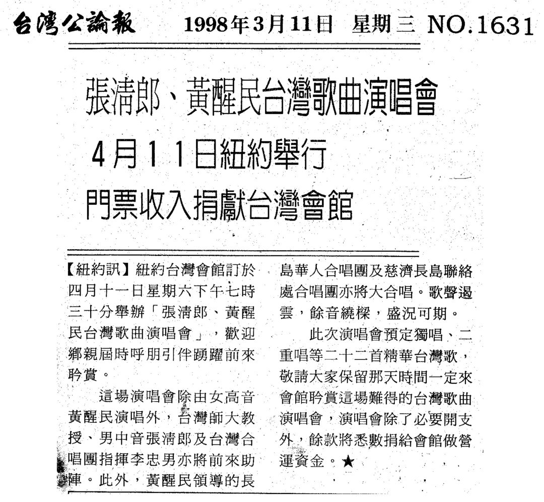 96. 張清郎、黃醒民台灣歌曲演唱會 by 紐約台灣會館, Flushing, NY on 04/11/1998 March 14, 2017 Admin1 Musical Concerts Source from Taiwan Tribune 台灣公論報 Issues 1631, 03/11/1998 Posted in 03/2017