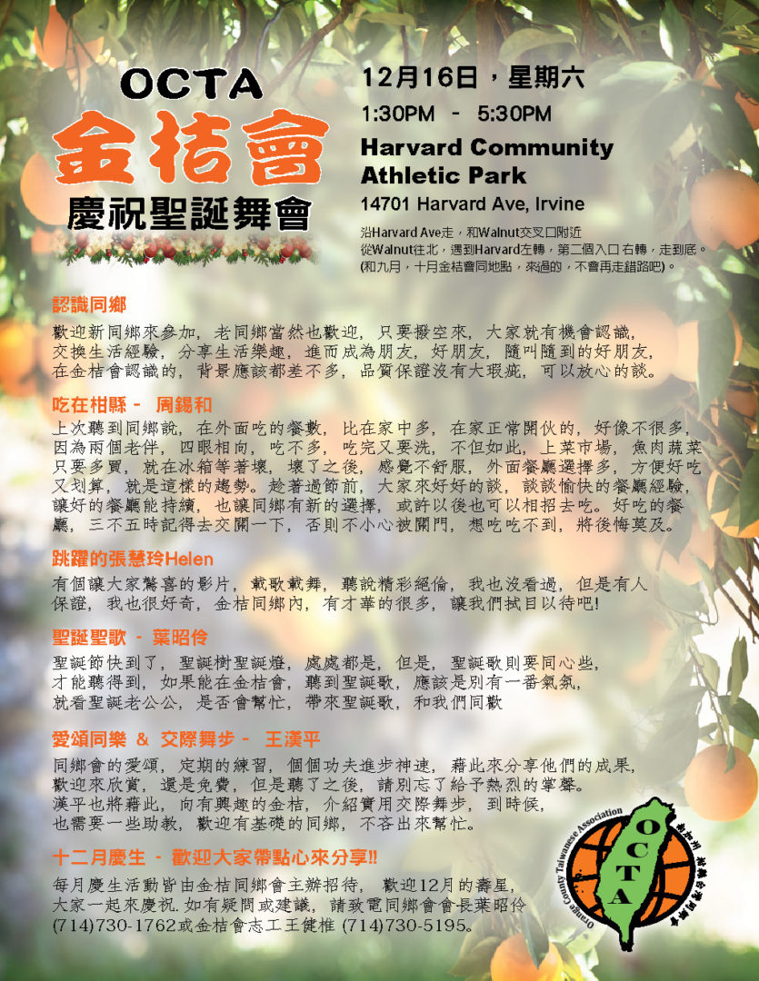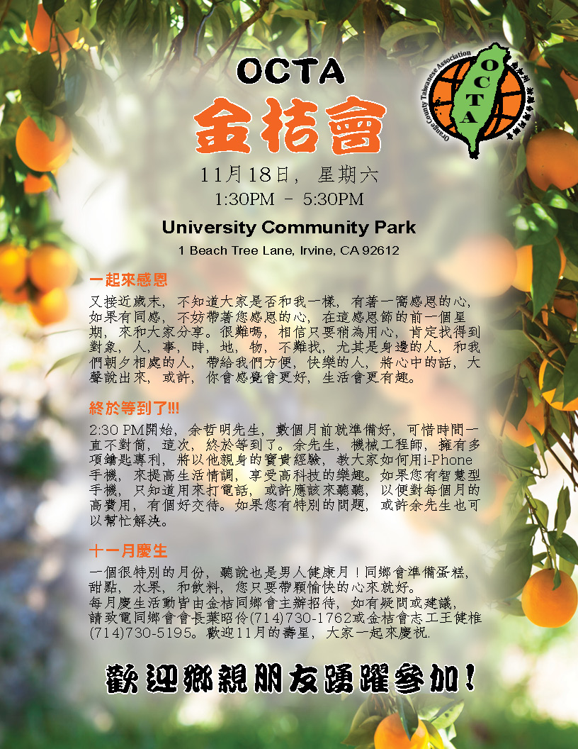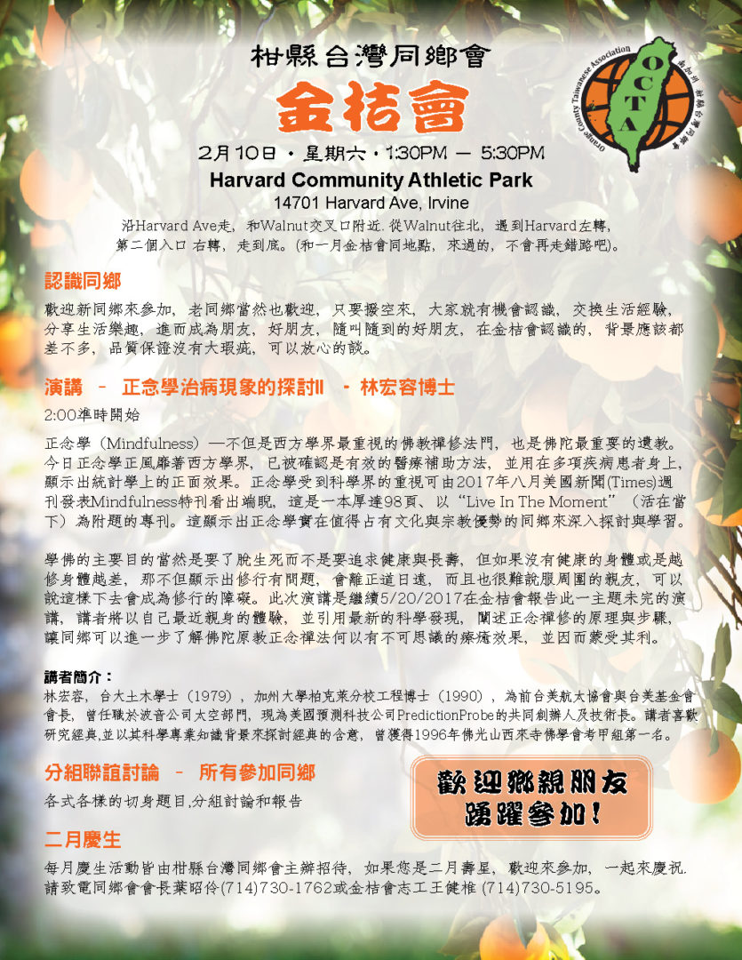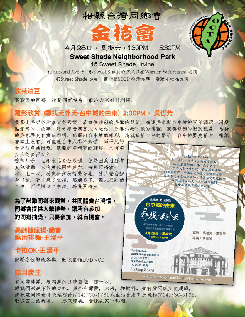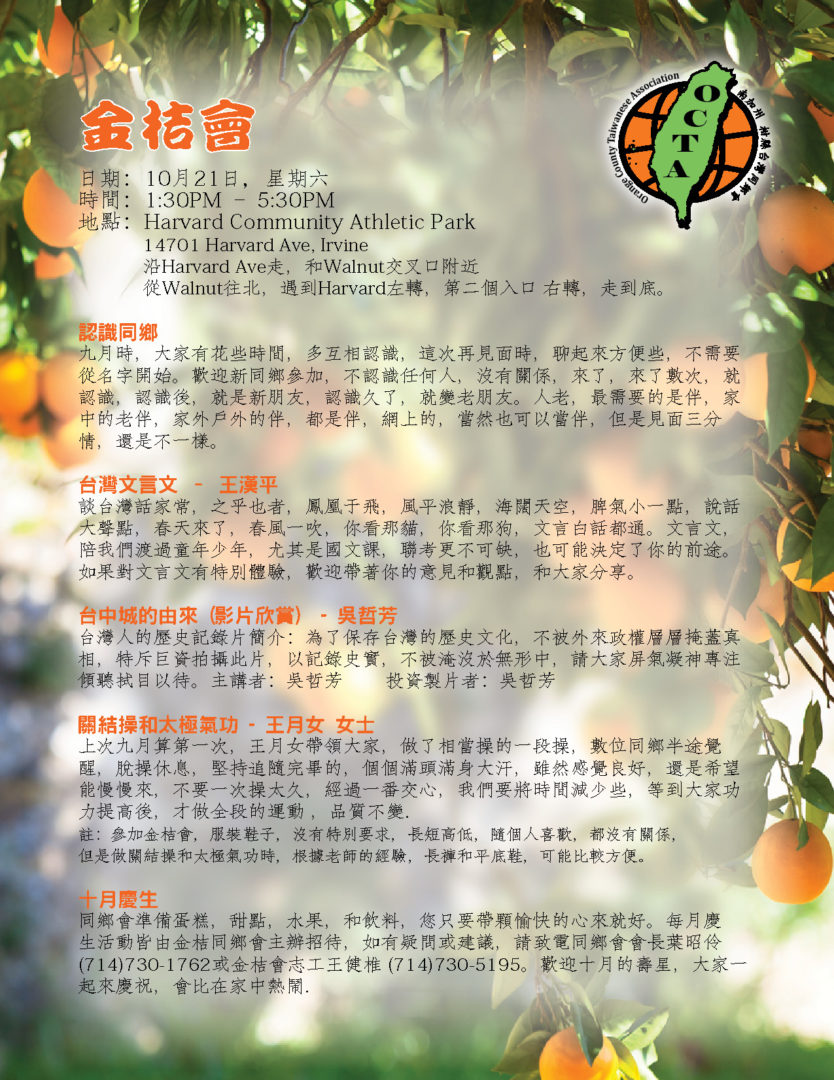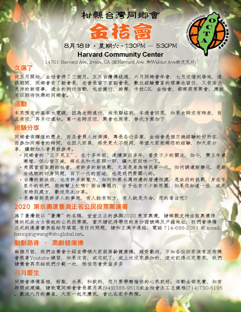 認識同鄉 花些時間,大家互相認識,尤其是新來的同鄉,更需要介紹,而同鄉會,金桔會,都是認識新朋友的好地方,認識後,大家更談得來,擴充生活面,交換生活樂趣,增加歡樂時光,提高快樂指數。 電影欣賞 – 少林小和尚 少林寺,歷史上聞名千年,和尚,歷史悠久,少林和尚的功夫電影,也處處可見,但是加個小字,對我來說,則是相當新鮮。一群六到十二歲的小孩,遠離父母和家鄉,過著和人世相隔的生活,他們嚴謹的訓練,虔誠的學習,素食的生活,和社會一般學童大不相同。他們的夢想,很簡單,就是去參觀北京天安門,令人聽了有點心酸,但是他們的功夫,可不是蓋的,看了只有讚嘆。很值得欣賞的一部紀錄片。 關結操和太極氣功– 王月女女士 別懷疑,名字沒有寫錯,這個課題的老師,姓王,名月女,英文名字Grace,將以她多年的經驗,帶領我們做簡單的健身操,當車齡高的時,需要更多的保養,當年齡高的時候,鍛練身體,更是不能缺席的課題,而要找到動作簡單,對筋骨負荷不高,效果良好的運動,則不是很容易。有興趣的同鄉,歡迎來試一下,或許看完少林小和尚後,我們學起來,會更有勁。對了,太極氣功不是太極拳。 註:參加金桔會,服裝鞋子,沒有特別要求,長短高低,隨個人喜歡,都沒有關係,但是做關結操和太極氣功時,根據老師的經驗,長褲和平底鞋,可能比較方便。 九月慶生 同鄉會準備蛋糕,甜點,水果,和飲料,您只要帶顆愉快的心來就好。活動全部免費,如有疑問或建議,請致電同鄉會會長葉昭伶(714)730-1762或金桔會志工王健椎 |