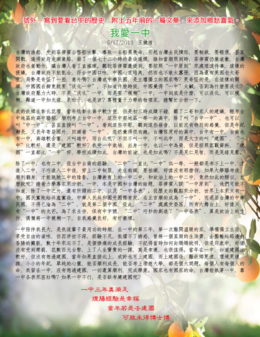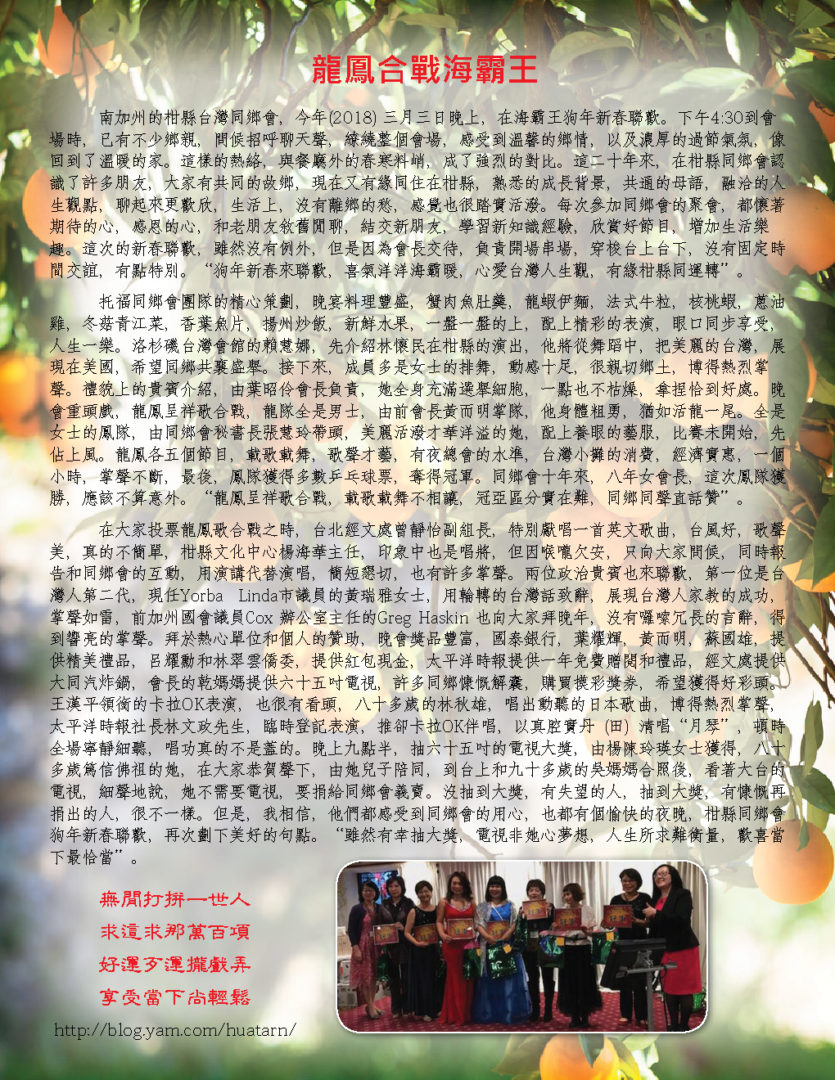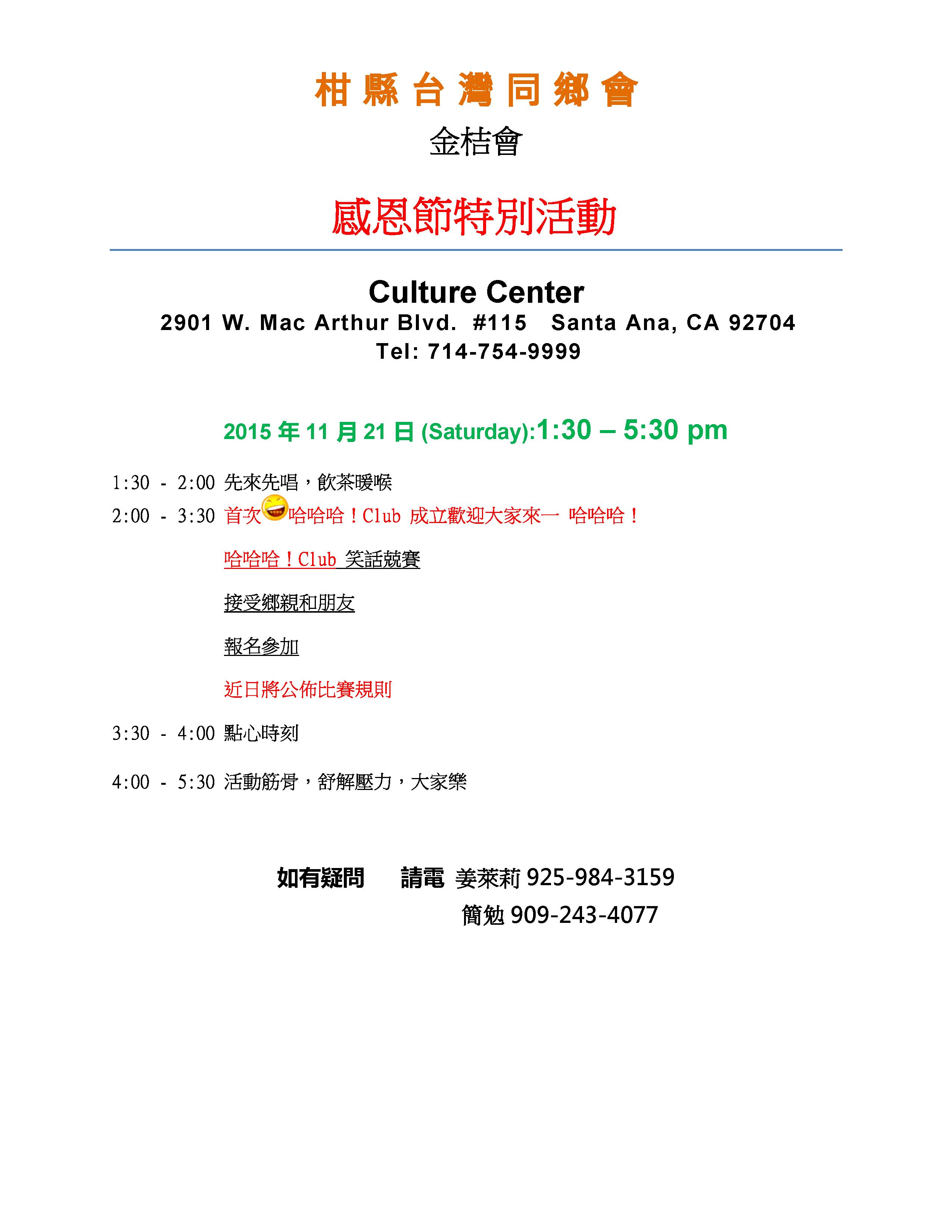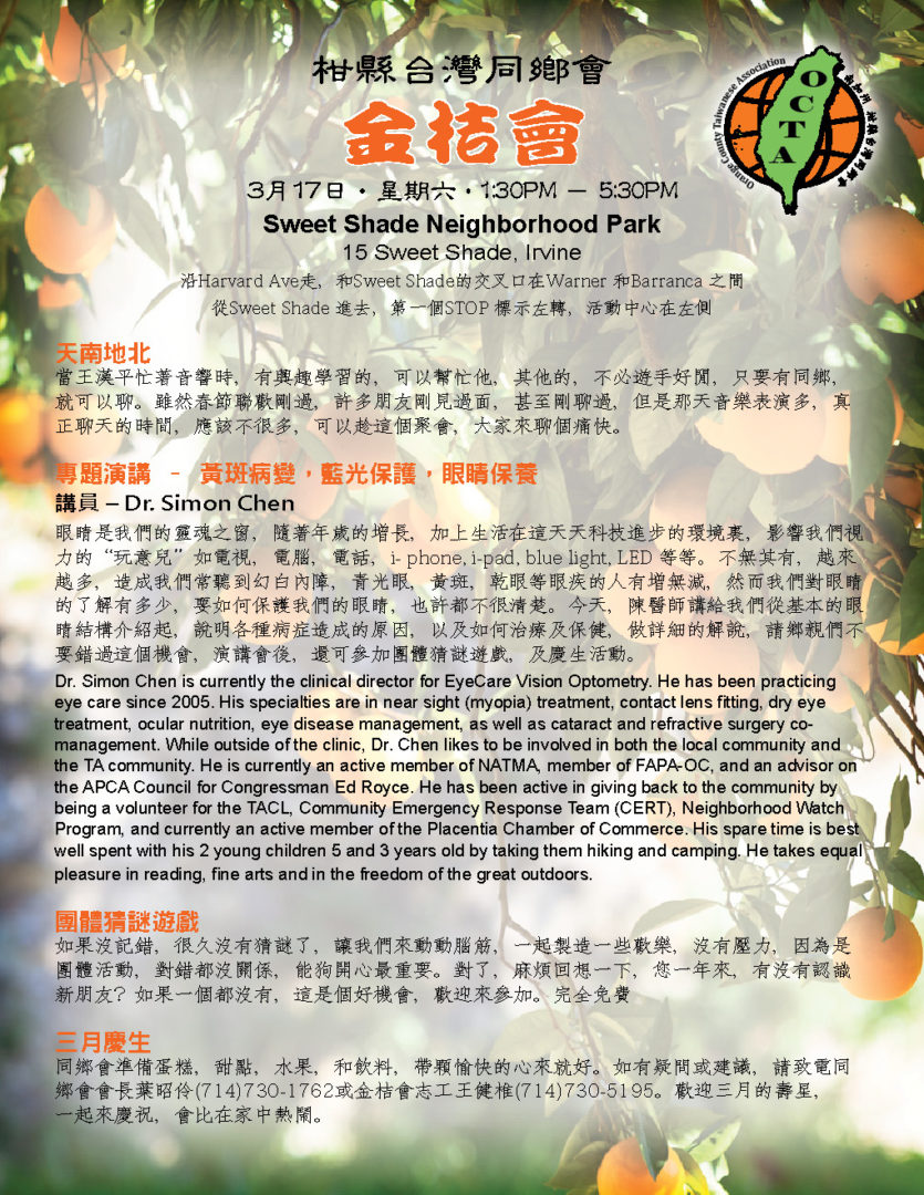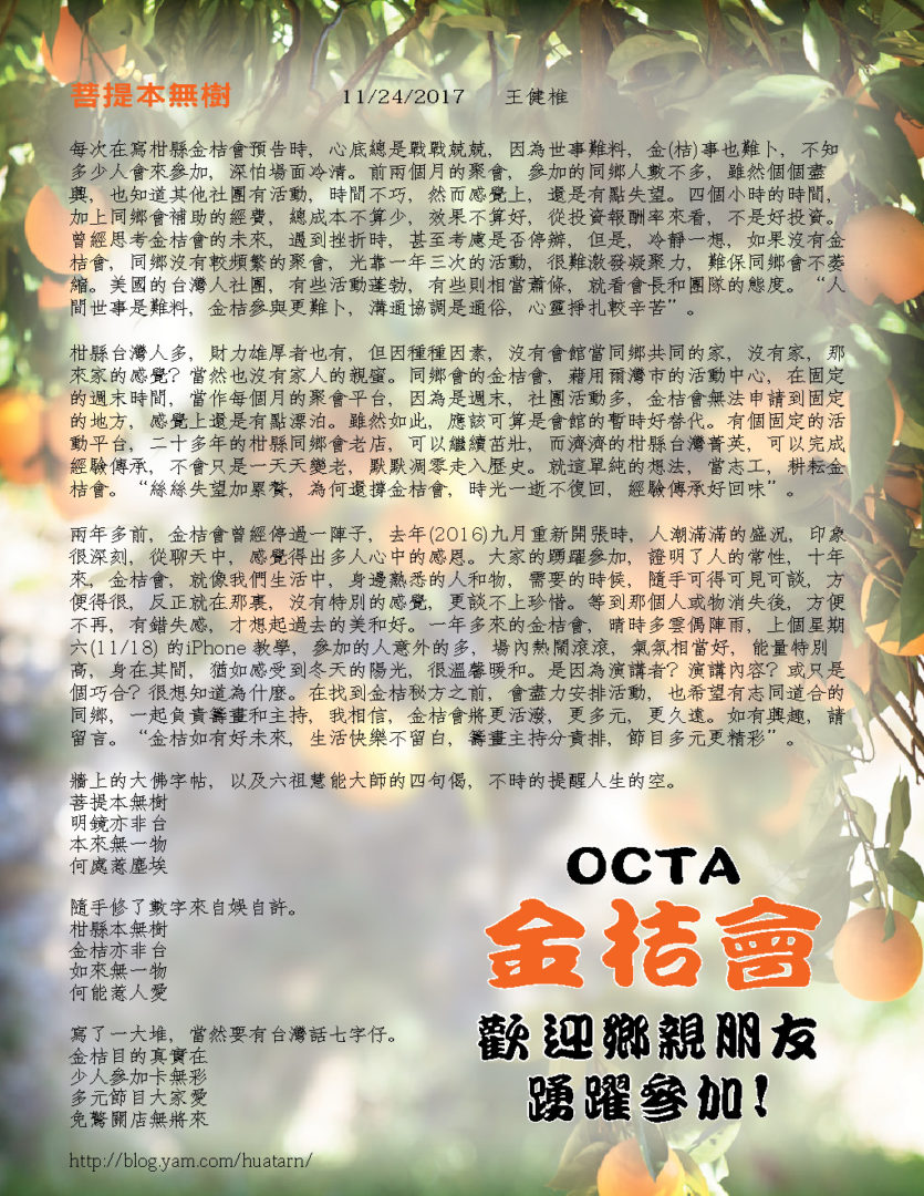 認識同鄉 花些時間,大家互相認識,尤其是新來的同鄉,更需要介紹,而同鄉會,金桔會,都是認識新朋友的好地方,認識後,大家更談得來,擴充生活面,交換生活樂趣,增加歡樂時光,提高快樂指數。 電影欣賞 – 少林小和尚 少林寺,歷史上聞名千年,和尚,歷史悠久,少林和尚的功夫電影,也處處可見,但是加個小字,對我來說,則是相當新鮮。一群六到十二歲的小孩,遠離父母和家鄉,過著和人世相隔的生活,他們嚴謹的訓練,虔誠的學習,素食的生活,和社會一般學童大不相同。他們的夢想,很簡單,就是去參觀北京天安門,令人聽了有點心酸,但是他們的功夫,可不是蓋的,看了只有讚嘆。很值得欣賞的一部紀錄片。 關結操和太極氣功– 王月女女士 別懷疑,名字沒有寫錯,這個課題的老師,姓王,名月女,英文名字Grace,將以她多年的經驗,帶領我們做簡單的健身操,當車齡高的時,需要更多的保養,當年齡高的時候,鍛練身體,更是不能缺席的課題,而要找到動作簡單,對筋骨負荷不高,效果良好的運動,則不是很容易。有興趣的同鄉,歡迎來試一下,或許看完少林小和尚後,我們學起來,會更有勁。對了,太極氣功不是太極拳。 註:參加金桔會,服裝鞋子,沒有特別要求,長短高低,隨個人喜歡,都沒有關係,但是做關結操和太極氣功時,根據老師的經驗,長褲和平底鞋,可能比較方便。 九月慶生 同鄉會準備蛋糕,甜點,水果,和飲料,您只要帶顆愉快的心來就好。活動全部免費,如有疑問或建議,請致電同鄉會會長葉昭伶(714)730-1762或金桔會志工王健椎 |