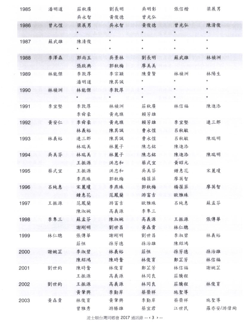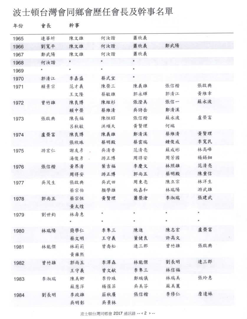 陳文雄、蕭欣義和何汝諧於1965年共同招集波士頓地區的台灣留學生、教授及就業人士成立Formosa Club,提供大家一交誼的機會,選出連華圻擔任第一任會長,下列是從1965到2017的歷任會長及幹事名單。