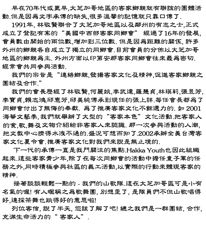 1991年成立於美國芝加哥, 2002年在伊利諾州, 正式登記為一個非營利組織. 我們的宗旨是 “聯絡鄉親, 發揚客家文化和精神, 促進客家鄉親們之間的團結與合作”. 目前大約有300位會員.