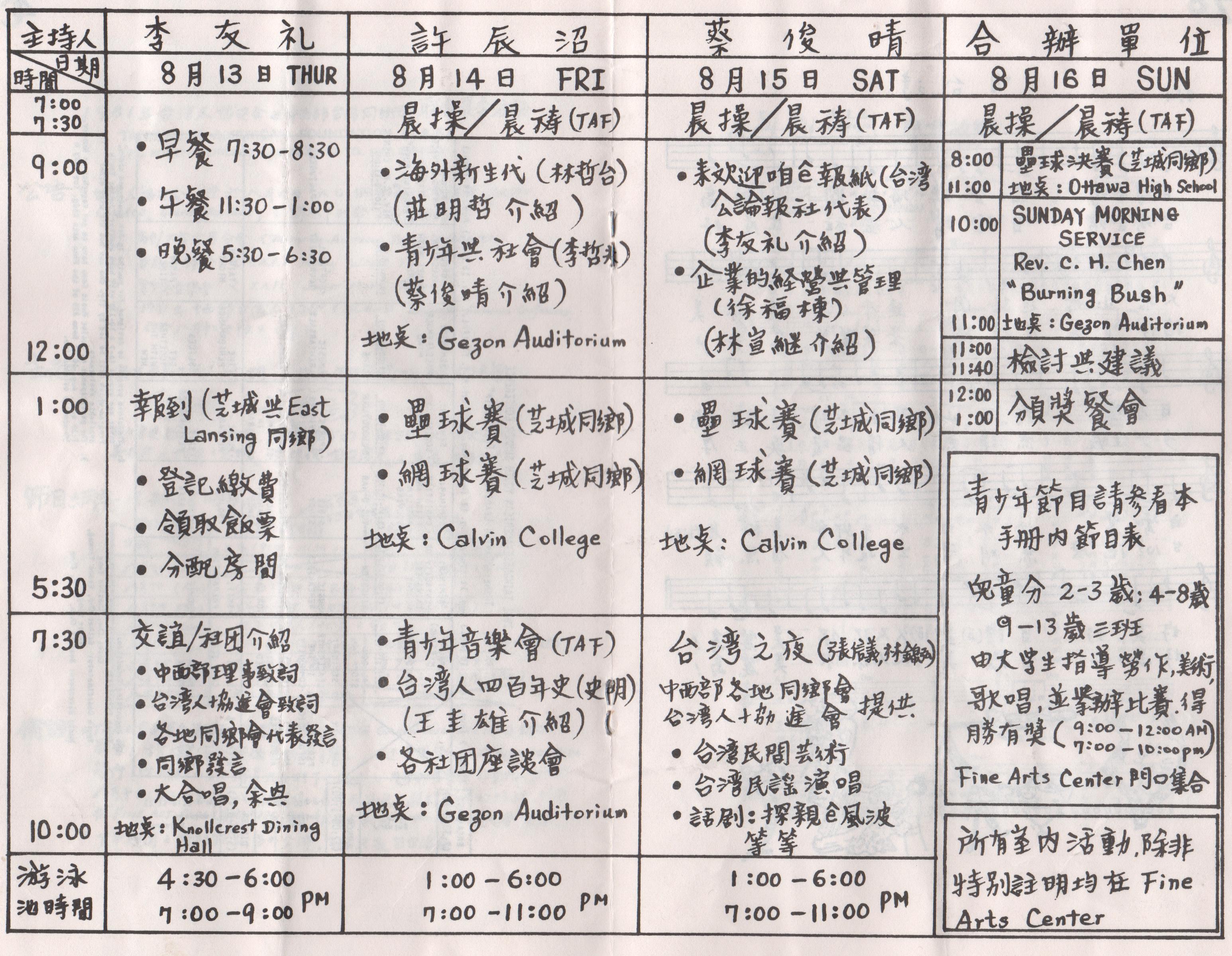 美國中西部夏令會在芝城台灣同鄕會的精心擘劃籌備下,選定環境優美,各項設備俱全的卡爾文學院擧行,該學院位于密西根州格蘭拉匹茲。